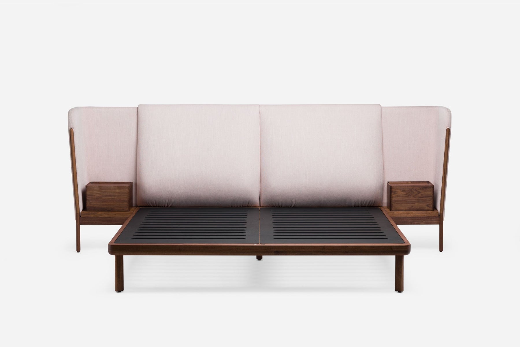 Available in black walnut, white oak, or ash in a range of finishes, and a range of fabric and leather options. Platform base is black stained MDF with holes for air circulation. See menus below for further material information.