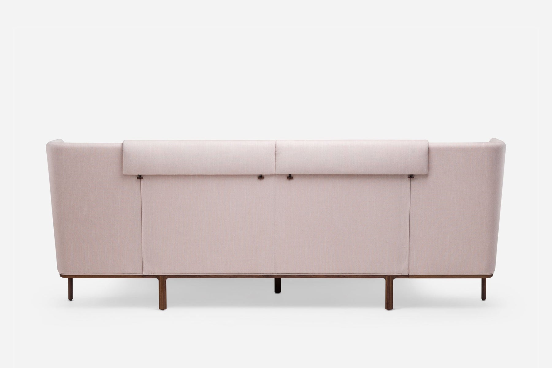 Dubois is a bed system crafted in premium solid hardwood and luxurious fabrics. The wraparound headboard provides a sense of privacy, while the exposed timber frame and generous expanse of upholstery celebrates the quality of materials and craft. Suitable for residential or contract environments, the bed is available with a low or tall headboard, with or without integrated bedside tables.