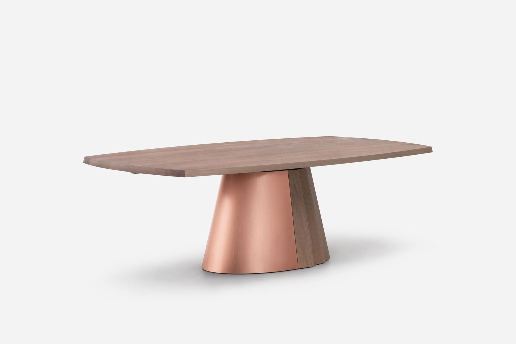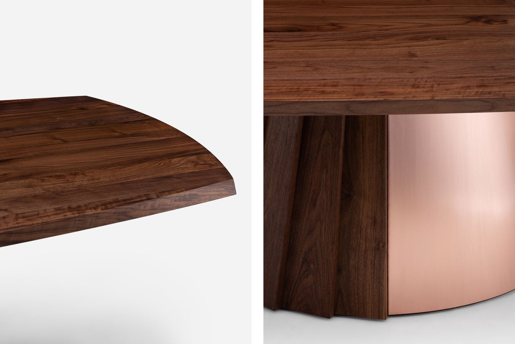 Orion, named after the most recognisable constellation in the night sky, artfully explores the concept of repetition with a central leg made from a series of overlapping solid wood slats forming a semi-oval met by a smooth curve of brass or copper. Expressing contemporary artistry, this table has a sculptural form imbued with the warmth of solid wood, bringing interest and a generous gathering place to any dining room.