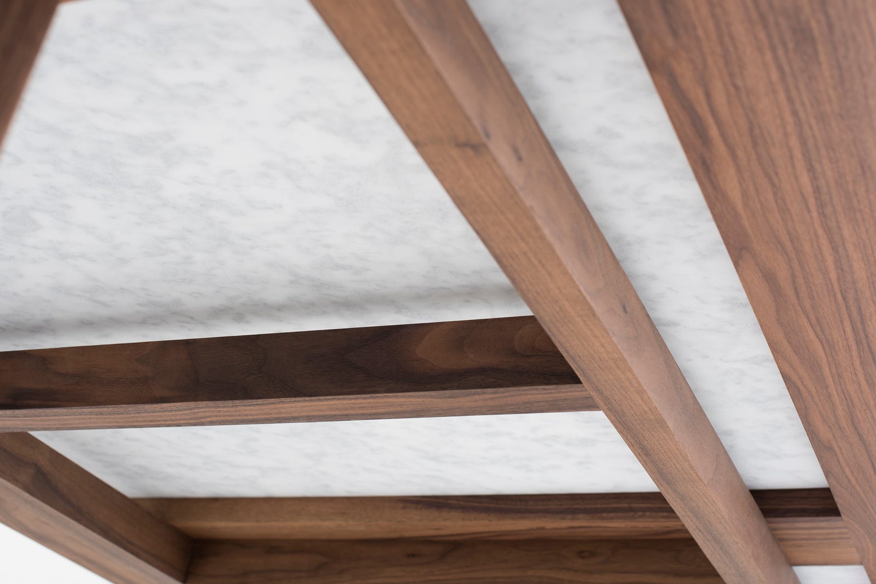 Available in black walnut, white oak, or ash in a range of finishes, with a tabletop in a choice of Carrara marble, Black Marquina marble, Rosa Negrais marble, or Ataija Creme limestone. Brushed brass detail on leg frame. See menus below for further material information.