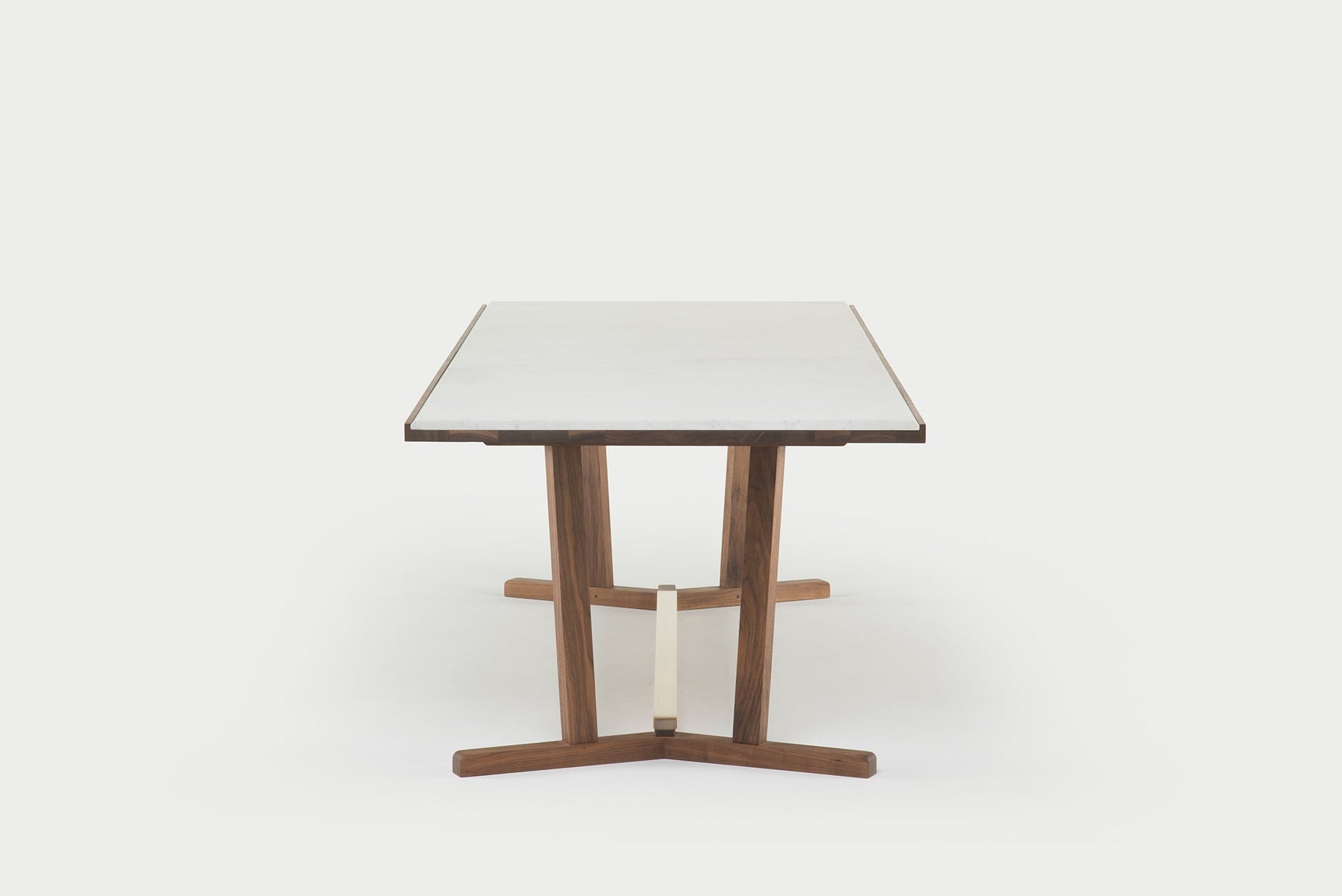 Shaker is a dining table inspired by the simple, honest and utilitarian approach of the movement after which it is named. An expansive plane of marble rests in the solid wood frame, highlighting the natural colour and grain of the stone. The wooden leg frame recalls that of a refectory table, and includes a brushed brass detail on the cross beam.
