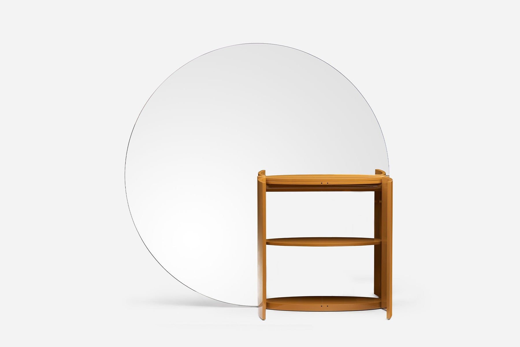 Tai In plays with reflection and its powerful effect on perception. Its large round mirror divides and reflects space, while its integrated cabinet provides practical storage space. There is no back or front: the mirror is double sided, as is the cabinet which opens on both sides.