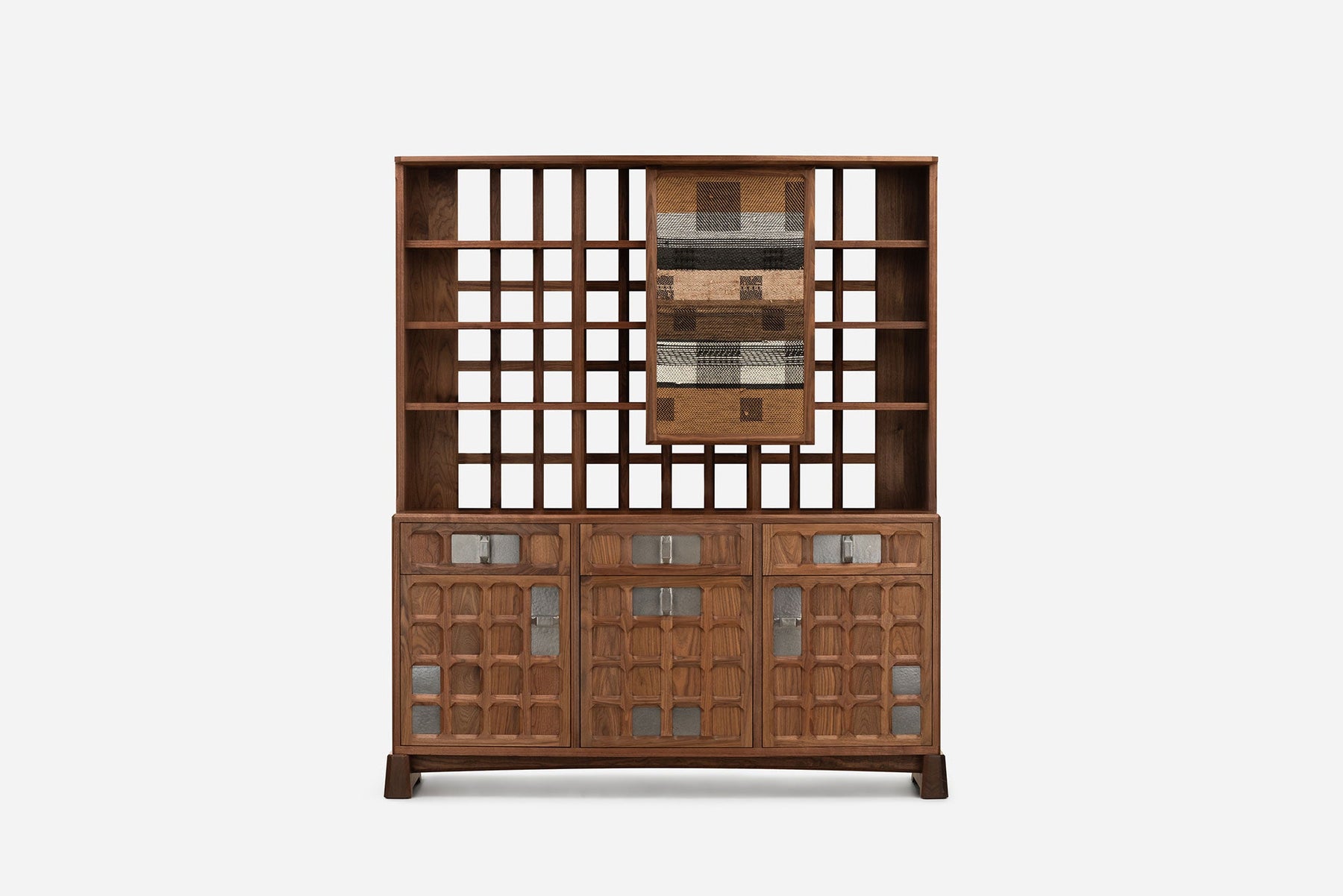 This special edition cabinet is available in Danish oiled walnut, grey ceramic, and a single-edition textile art panel hand woven in London by textile artist Catarina Riccabona. See menus below for further material information.