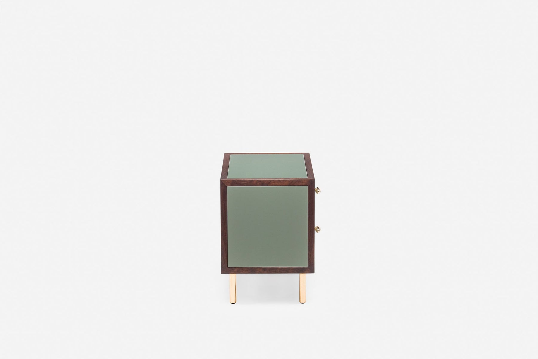 Available in black walnut, white oak, or ash in a range of finishes; with painted HDF in a choice of our full range of colours with a satin matte or gloss finish. Legs and drawer pulls in polished brass. See menus below for further material information.