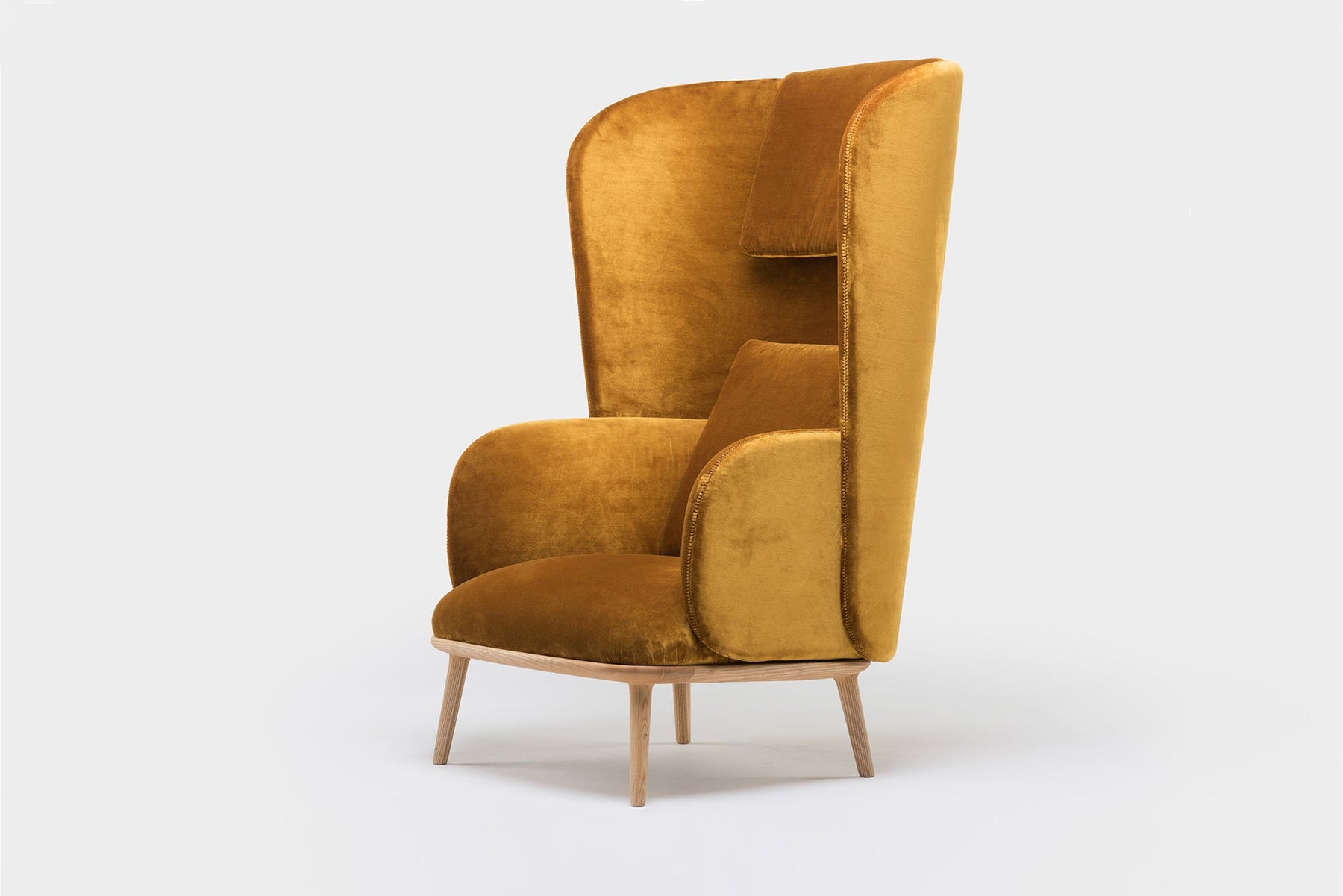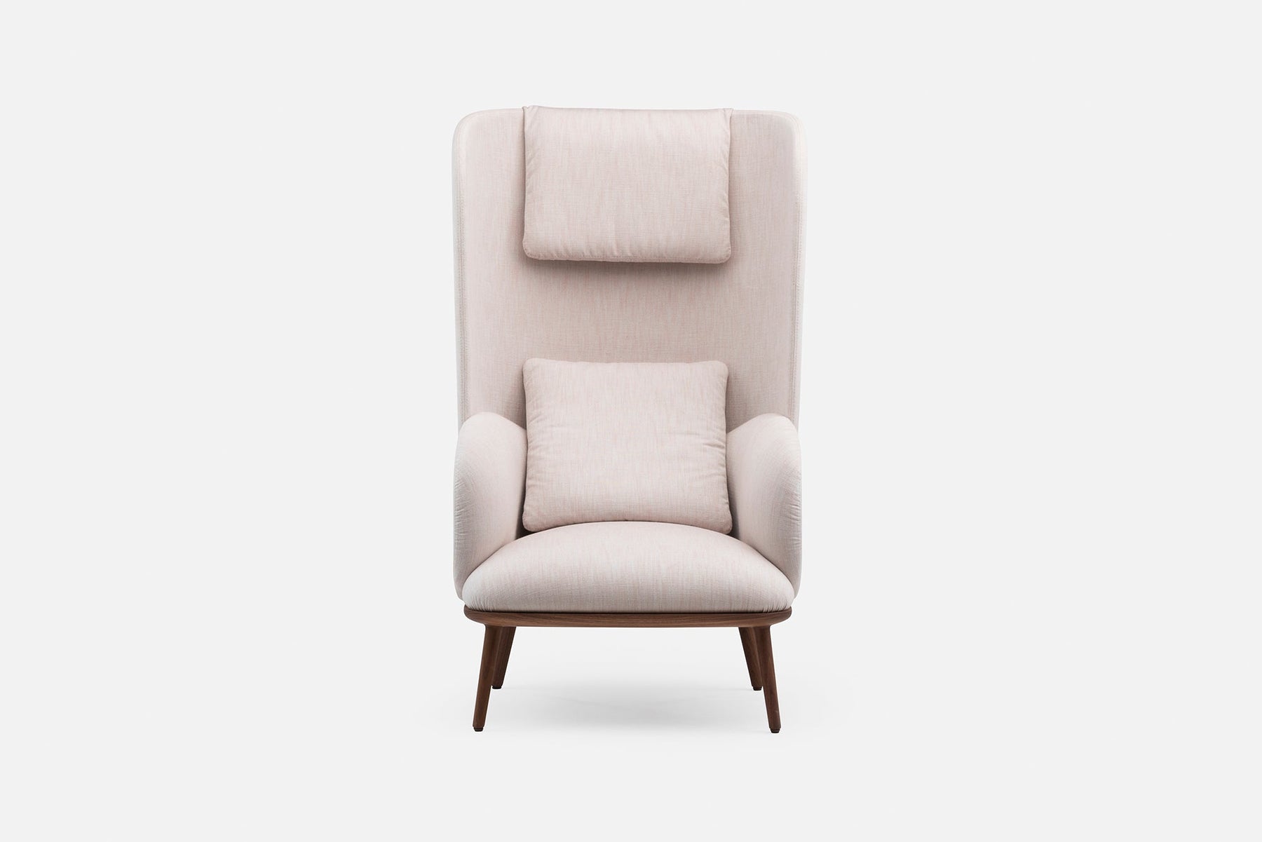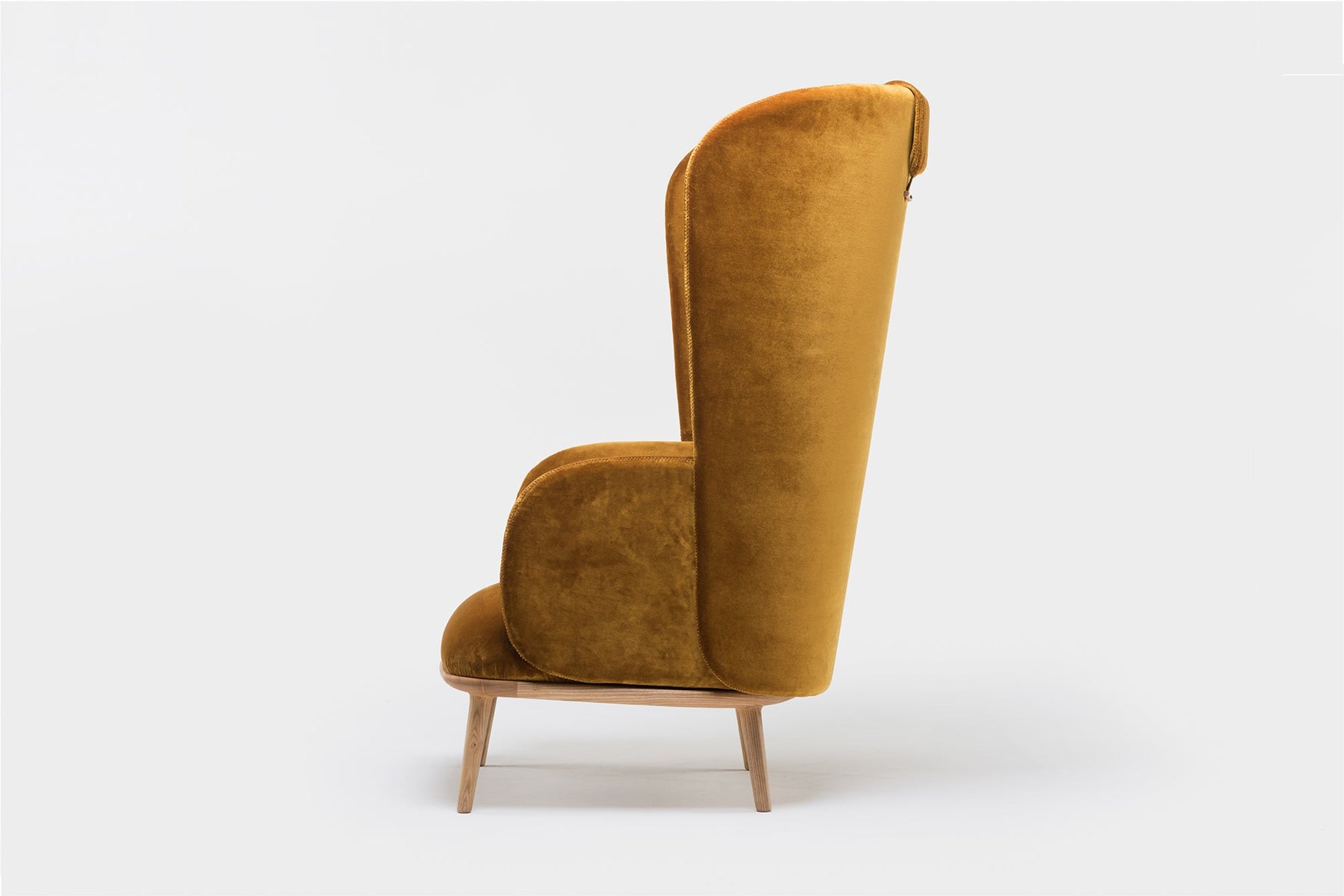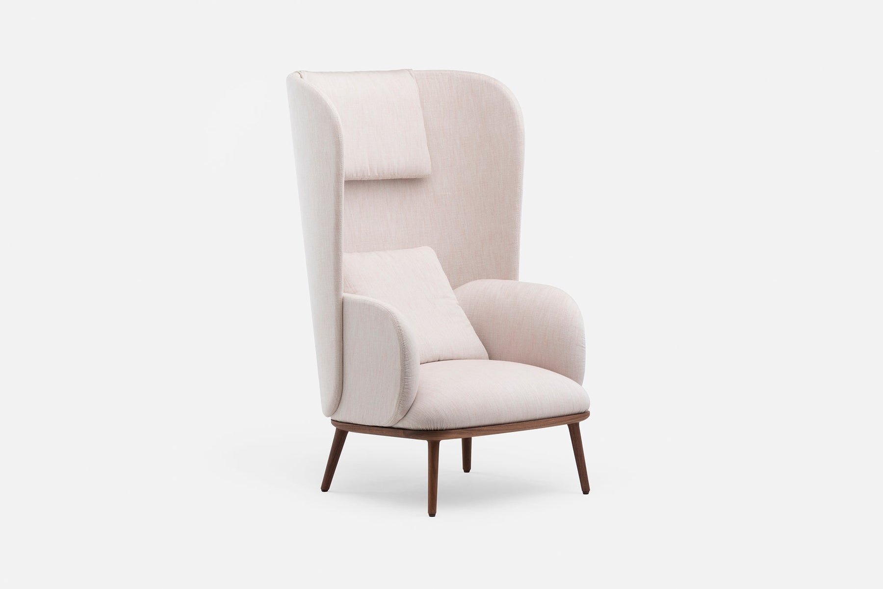 Blanche is an upright reading chair comprised of layers of upholstered shells, the wraparound form offering a sense of privacy. The taut upholstery on the shells is offset by a luxuriously soft seat and slender solid wood legs.