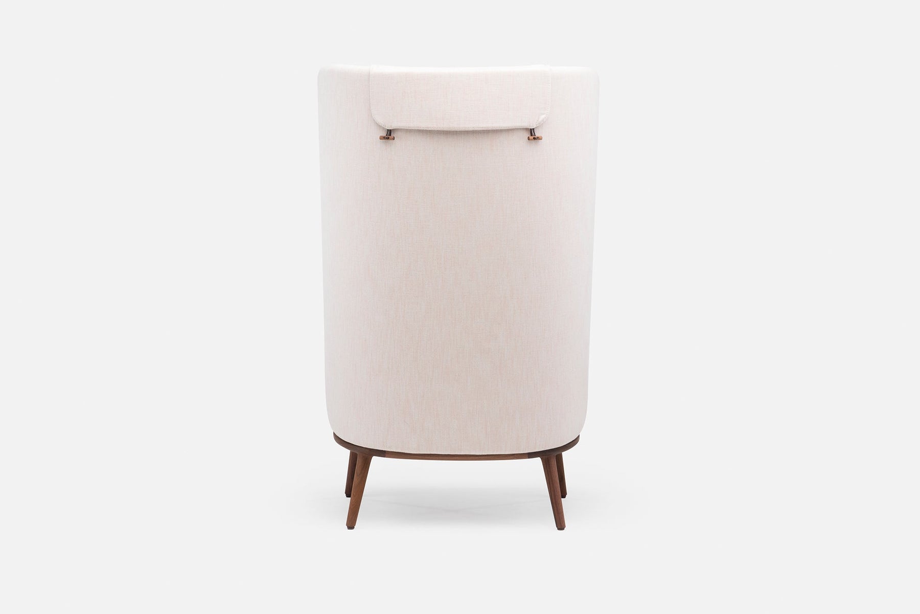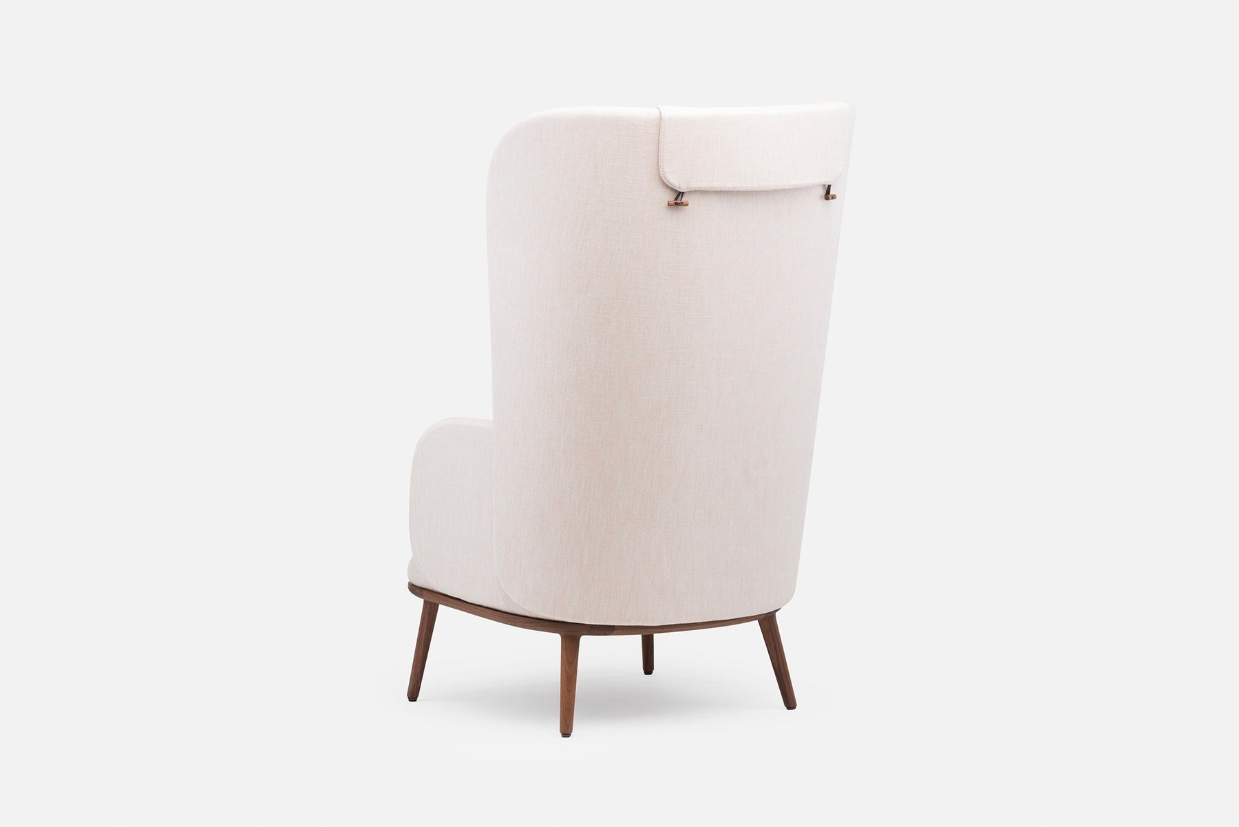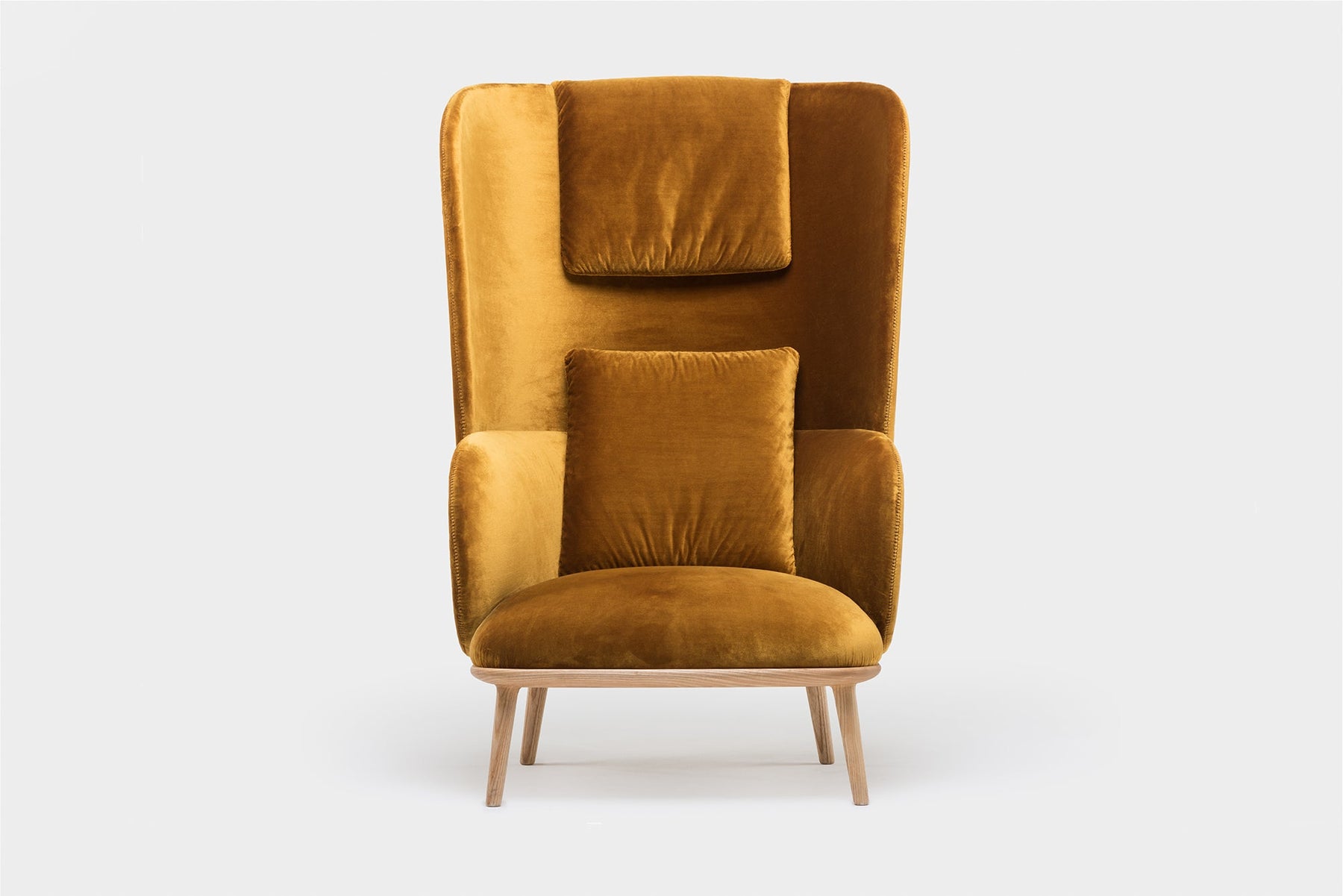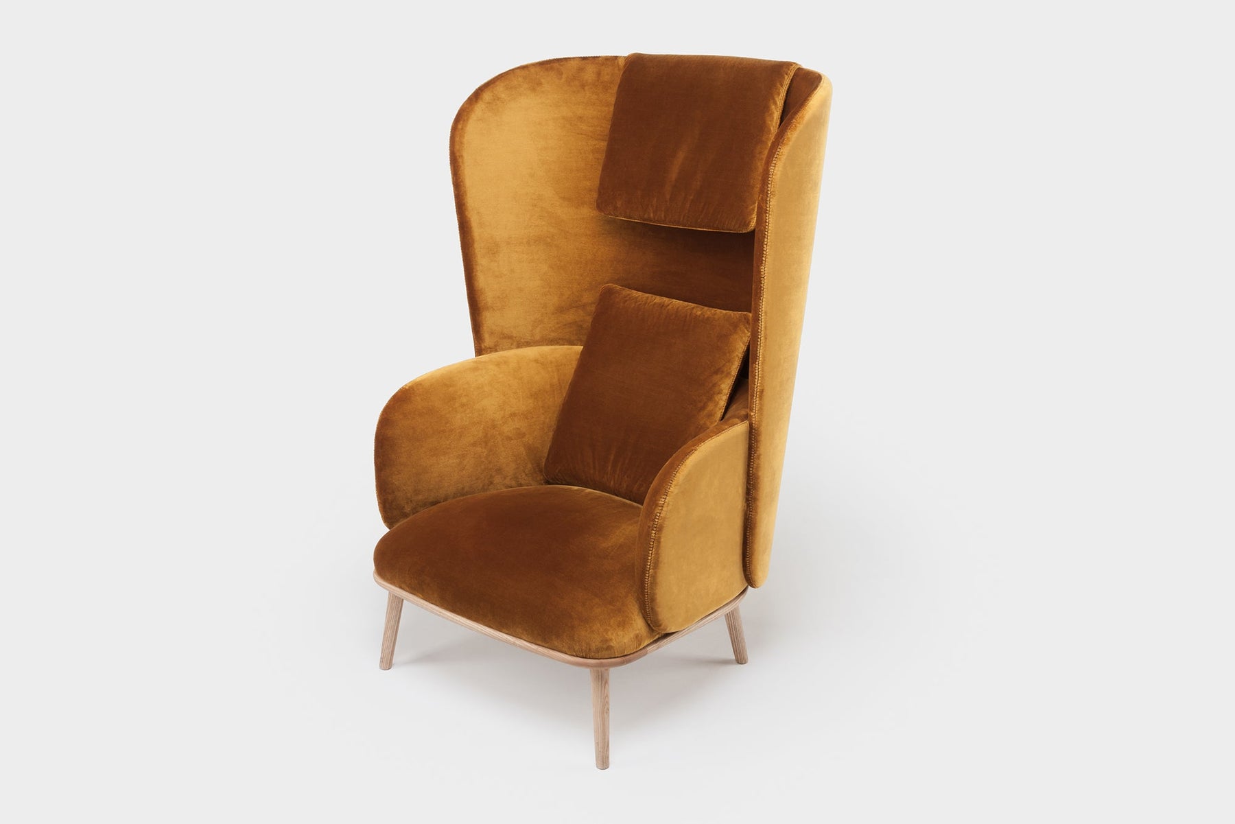 Blanche is an upright reading chair comprised of layers of upholstered shells, the wraparound form offering a sense of privacy. The taut upholstery on the shells is offset by a luxuriously soft seat and slender solid wood legs.