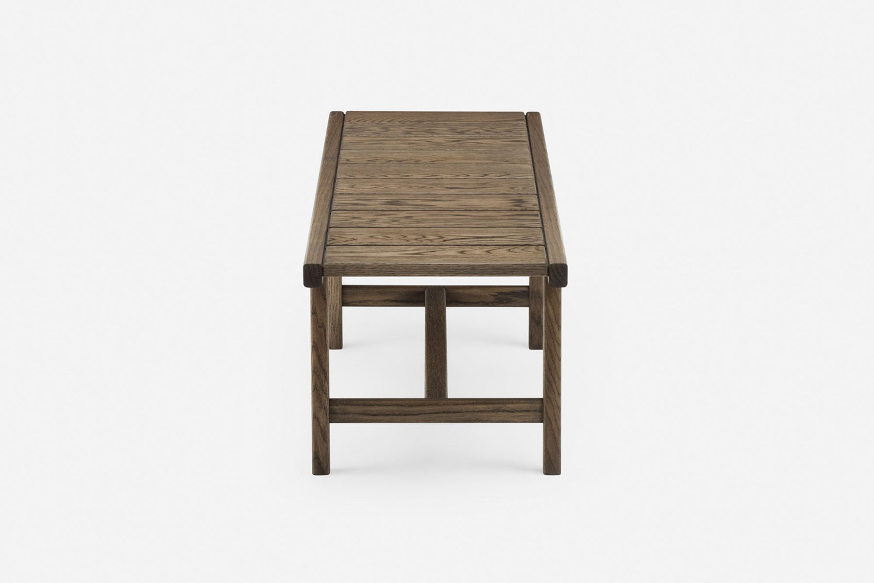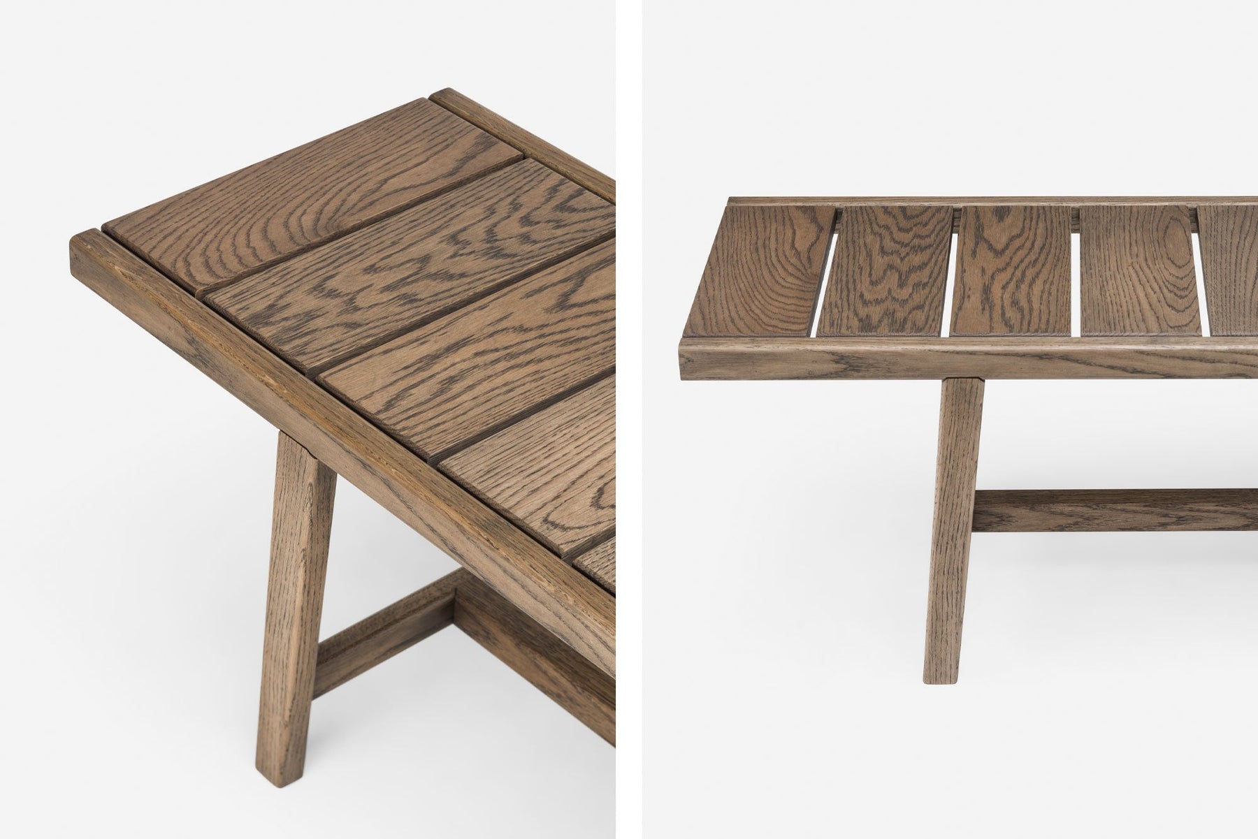 Our outdoor furniture is crafted from European white oak from Croatia. White oak from this region has a particularly high tannin content which naturally protects the wood from rot, making it particularly suitable for outdoor furniture. Oak has great density, outstanding durability and simple, understated beauty. We finish the timber with a black oil finish which darkens the grain and deepens the tone of the wood while providing water-repellant protection and a renewable surface for enduring beauty. Wood furniture used outdoors will age and adopt a beautiful silver grey/dark grey patina over time. Damage can be repaired with relative ease, as the timber can be reapplied with outdoor black oil at any moment.