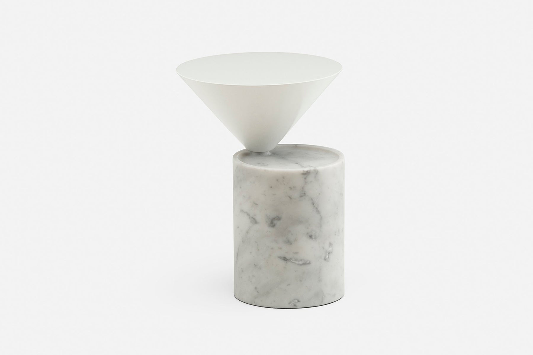Laurel is a side table composed of two intersecting geometric shapes, cone and cylinder. The painted HDF cone appears to balance weightlessly upon the cylindrical base of marble. This small side table has a sculptural form that complements any space. Laurel is also available with a timber base, or as a coffee table with a timber or marble base.
