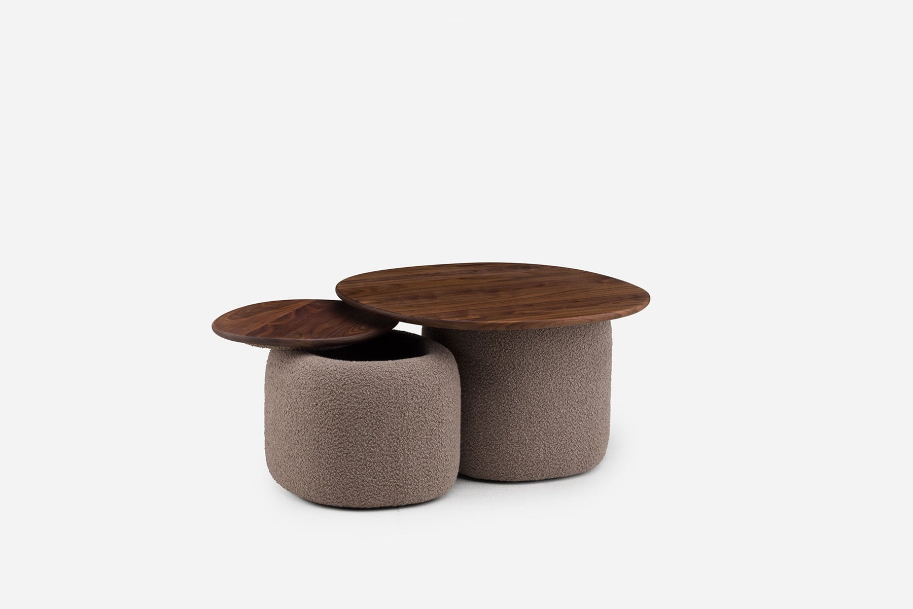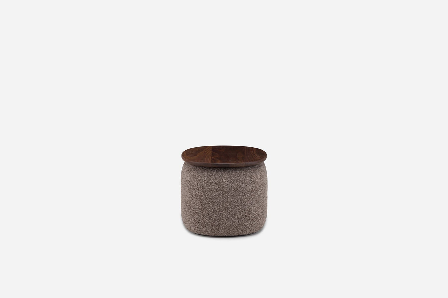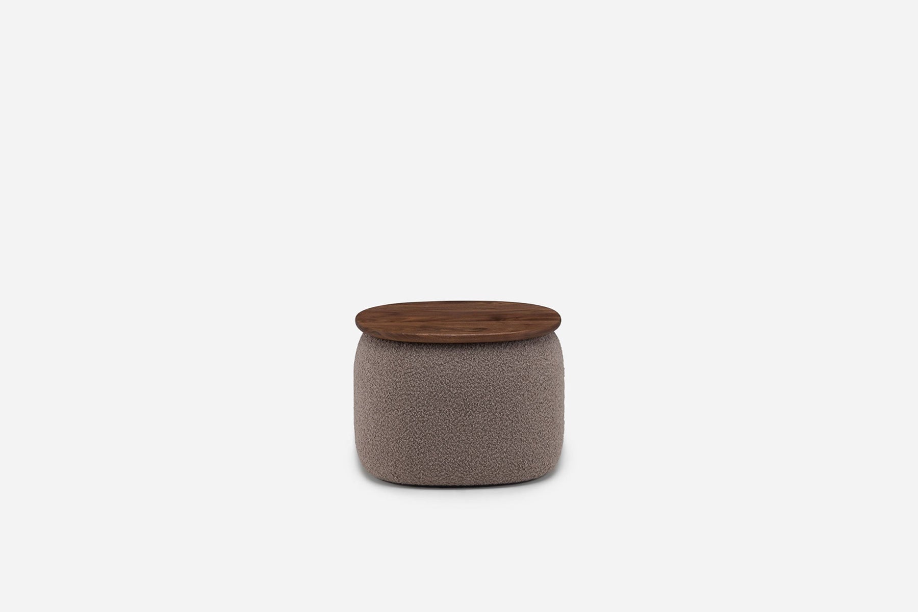 Corvo, part of the Azores collection by Luca Nichetto, is a small coffee table with a timber top set upon an upholstered base with an inner cavity for storage. The Azores collection comprises sofas and small tables, conceived as islands, allowing for flexible compositions to suit unique spaces. Each piece has a soft, rounded, sculptural shape made from luxurious upholstery and rich solid wood, highlighting the craft of De La Espada.