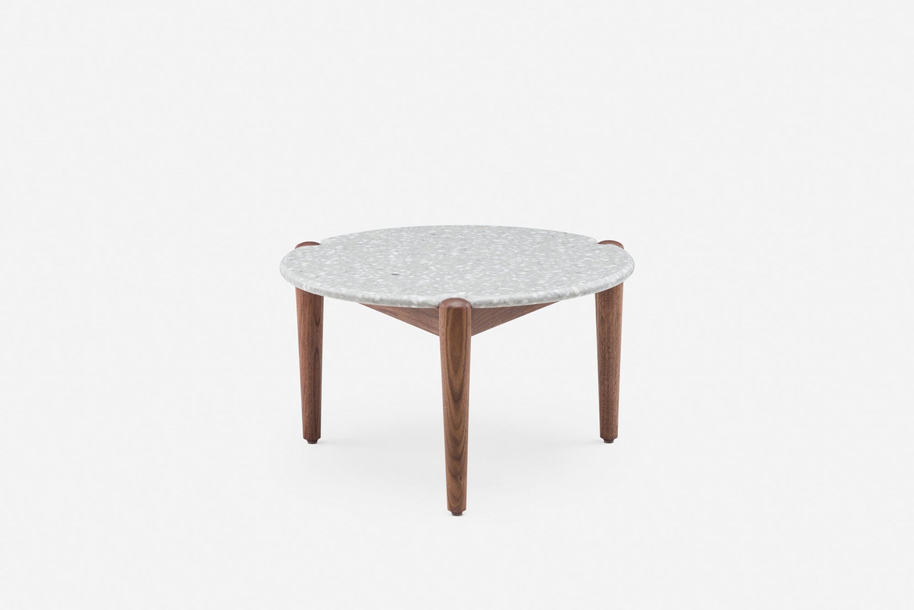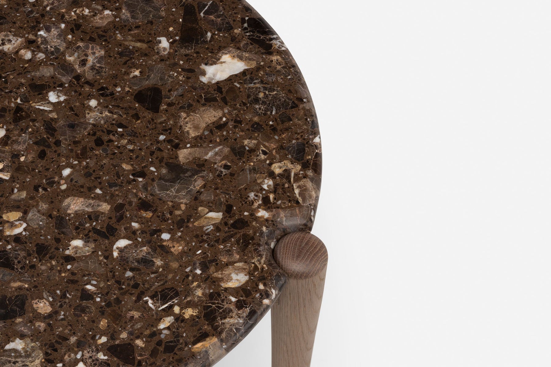 Sidekicks is a series of small occasional tables that live throughout the home to accommodate our different activities. A tabletop of terrazzo rests upon slender solid wood legs.
