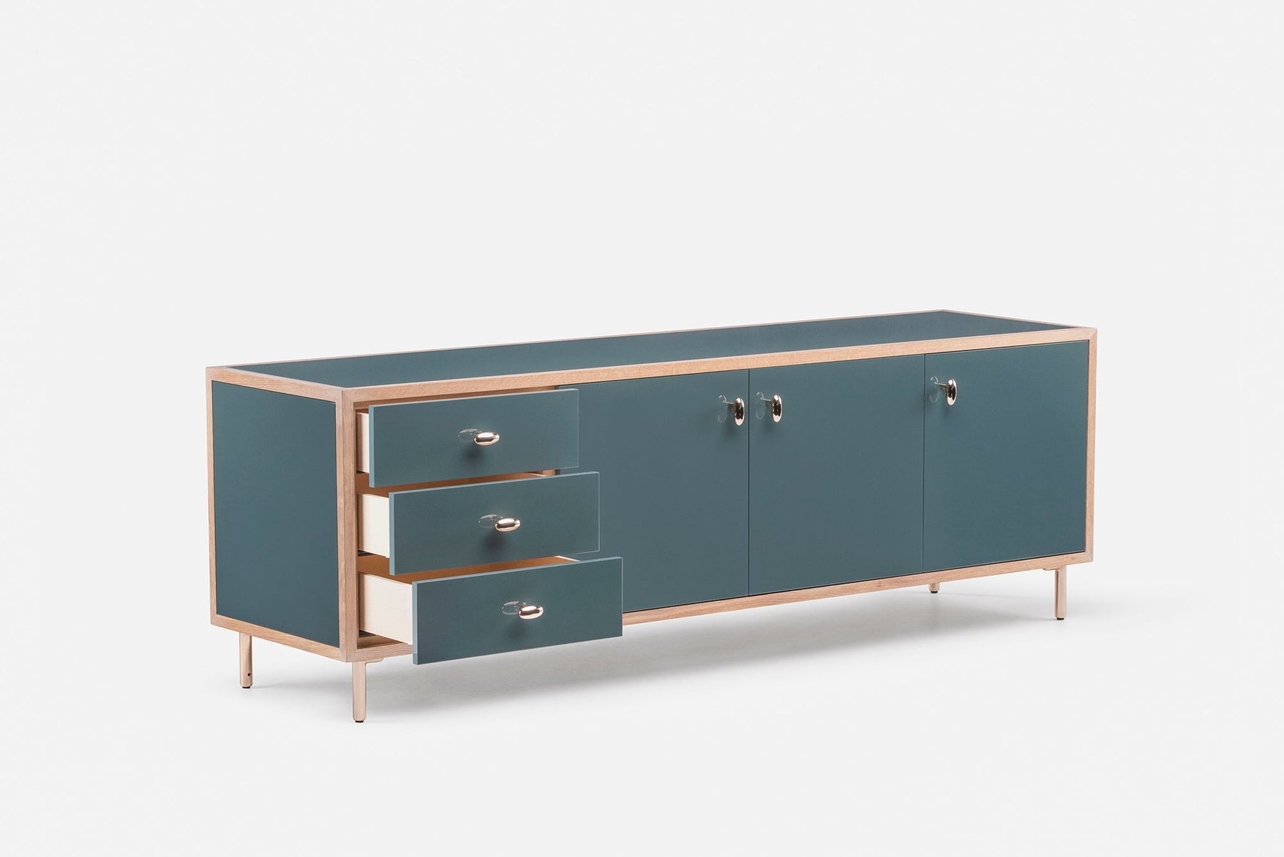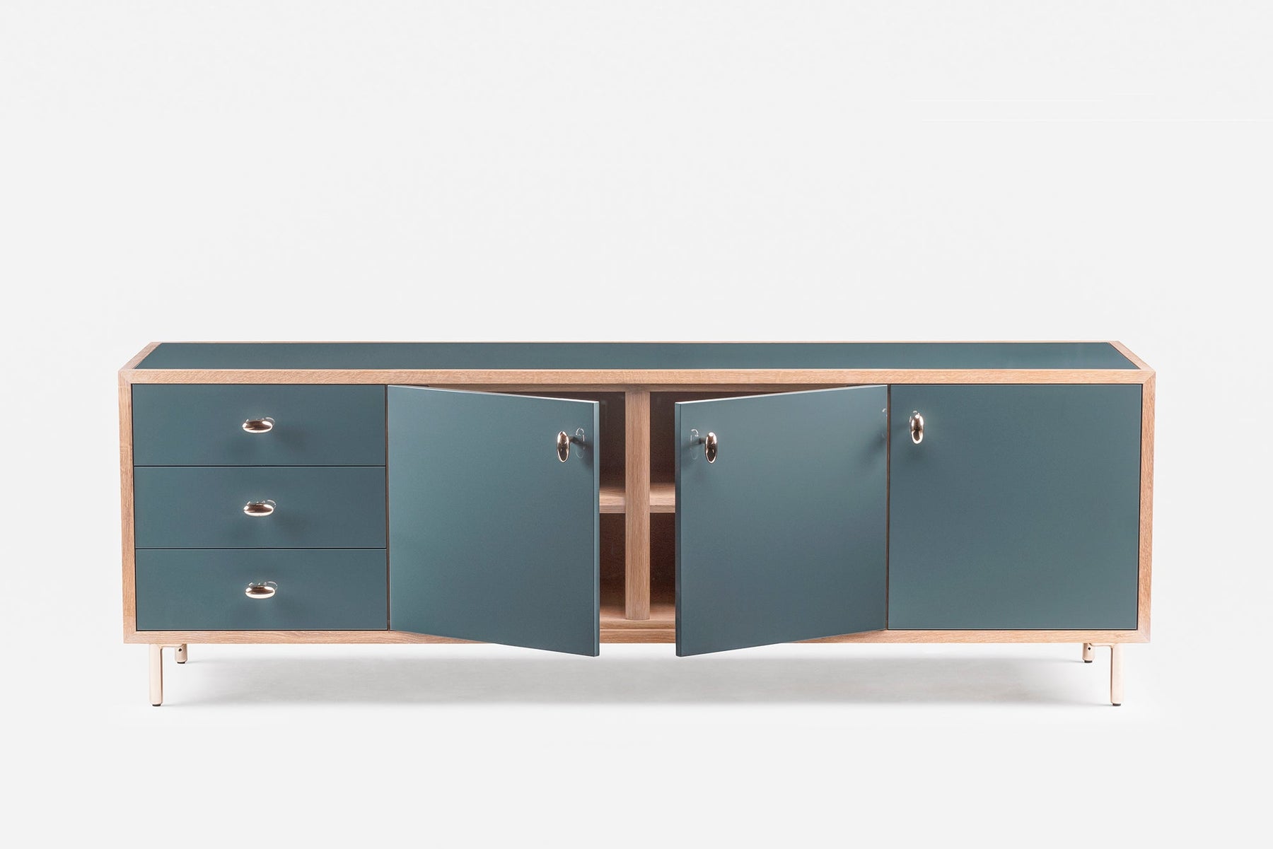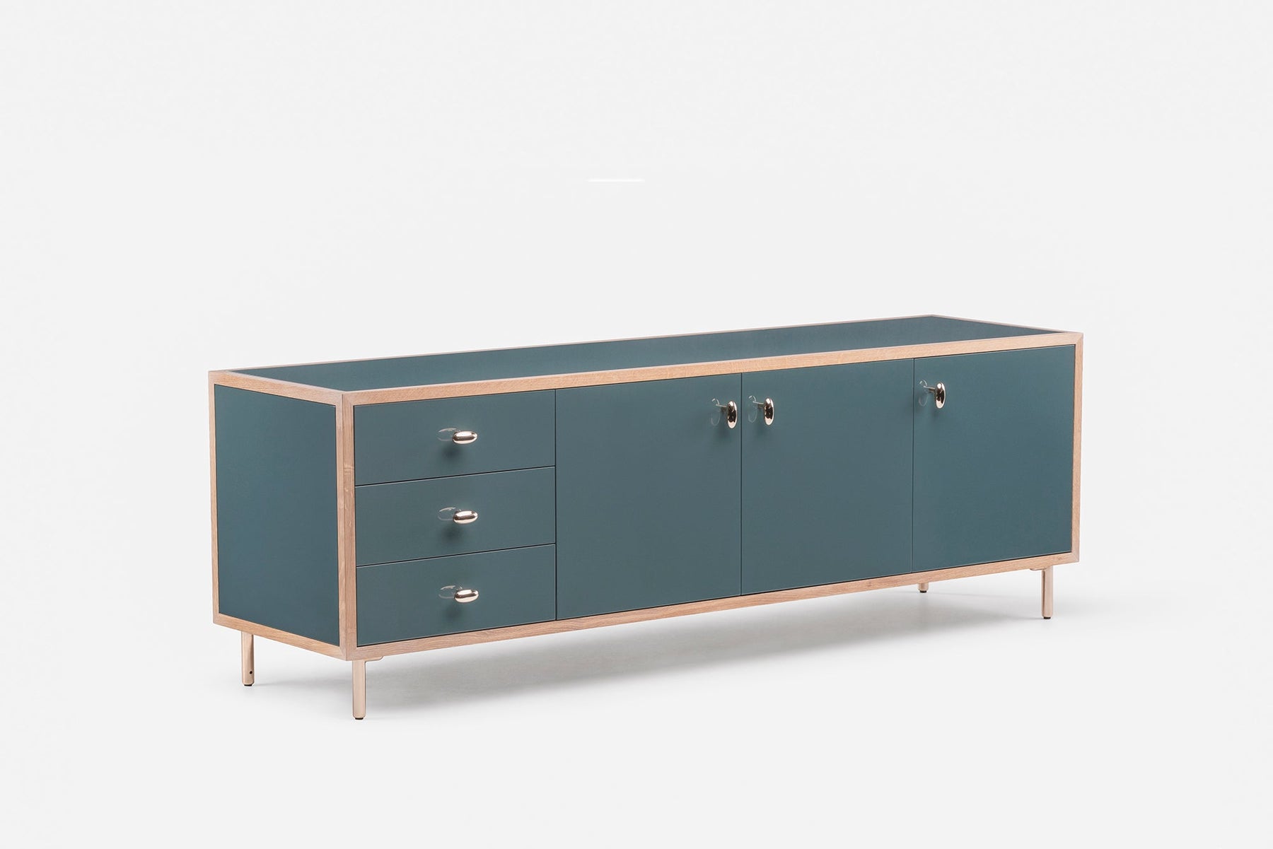 Inspired by the juxtaposition of old and new design seen in converted Brooklyn brownstones, Classon Sideboard is modern with historical references. Polished brass drawer pulls, door pulls, and legs elegantly complement the cabinet body available in painted hdf and a range of timbers and finishes.
