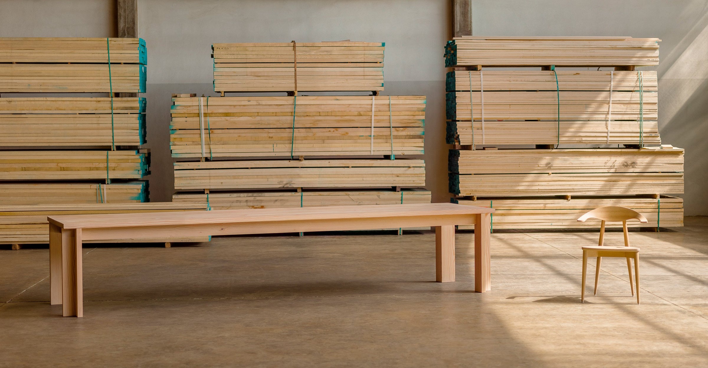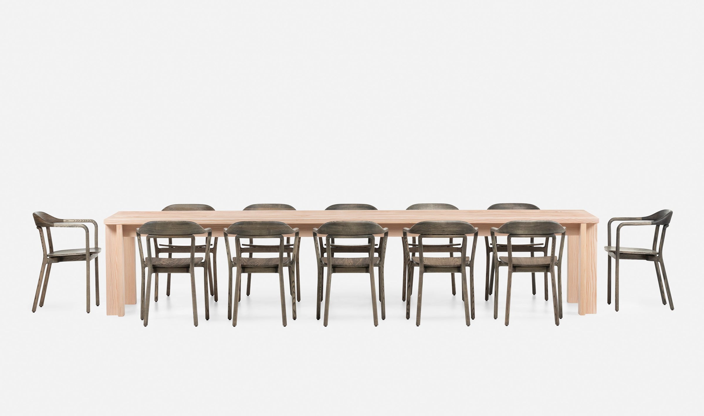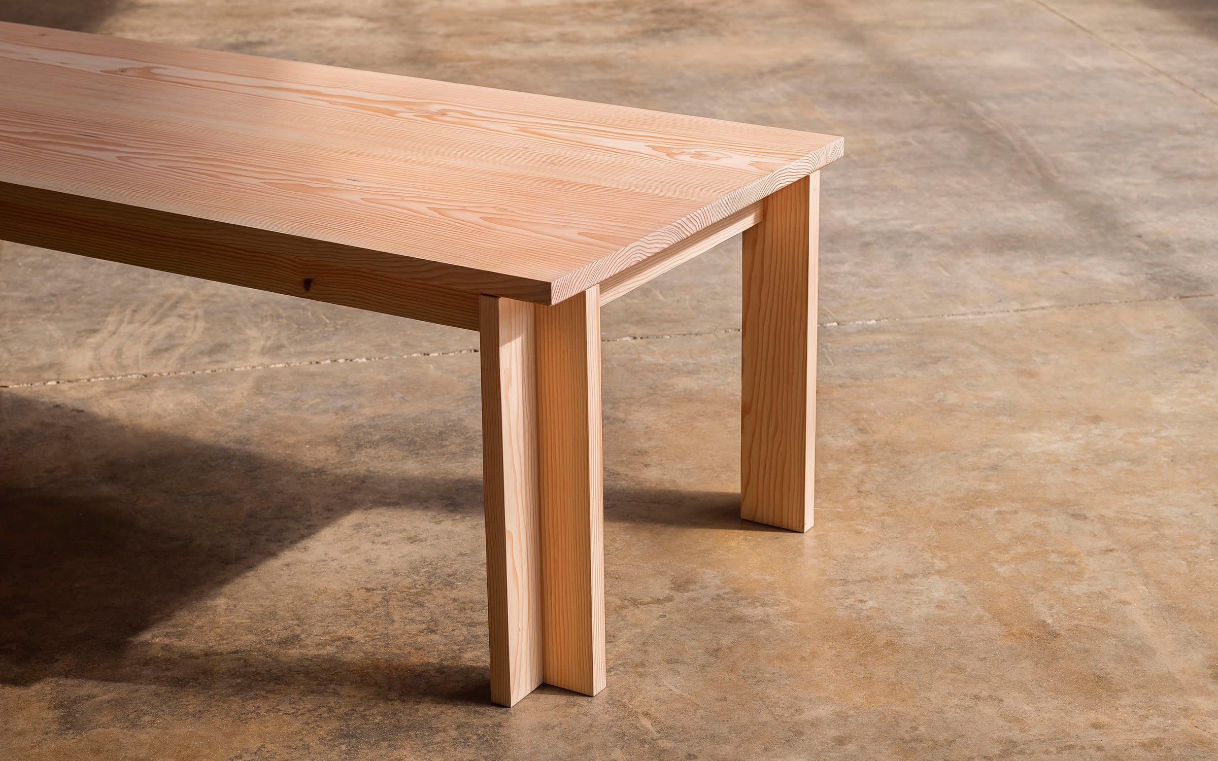 Table One reflects a universal heritage that is fixed without time or place. With an emphasis on function and the sensory response, this vast table, with lengths of up to 380cm (149 2/3”), has a tabletop made from just two planks of astonishingly proportioned planks of Douglas Fir timber. It is designed to be passed from generation to generation, earning the value of time and marks of memories past.