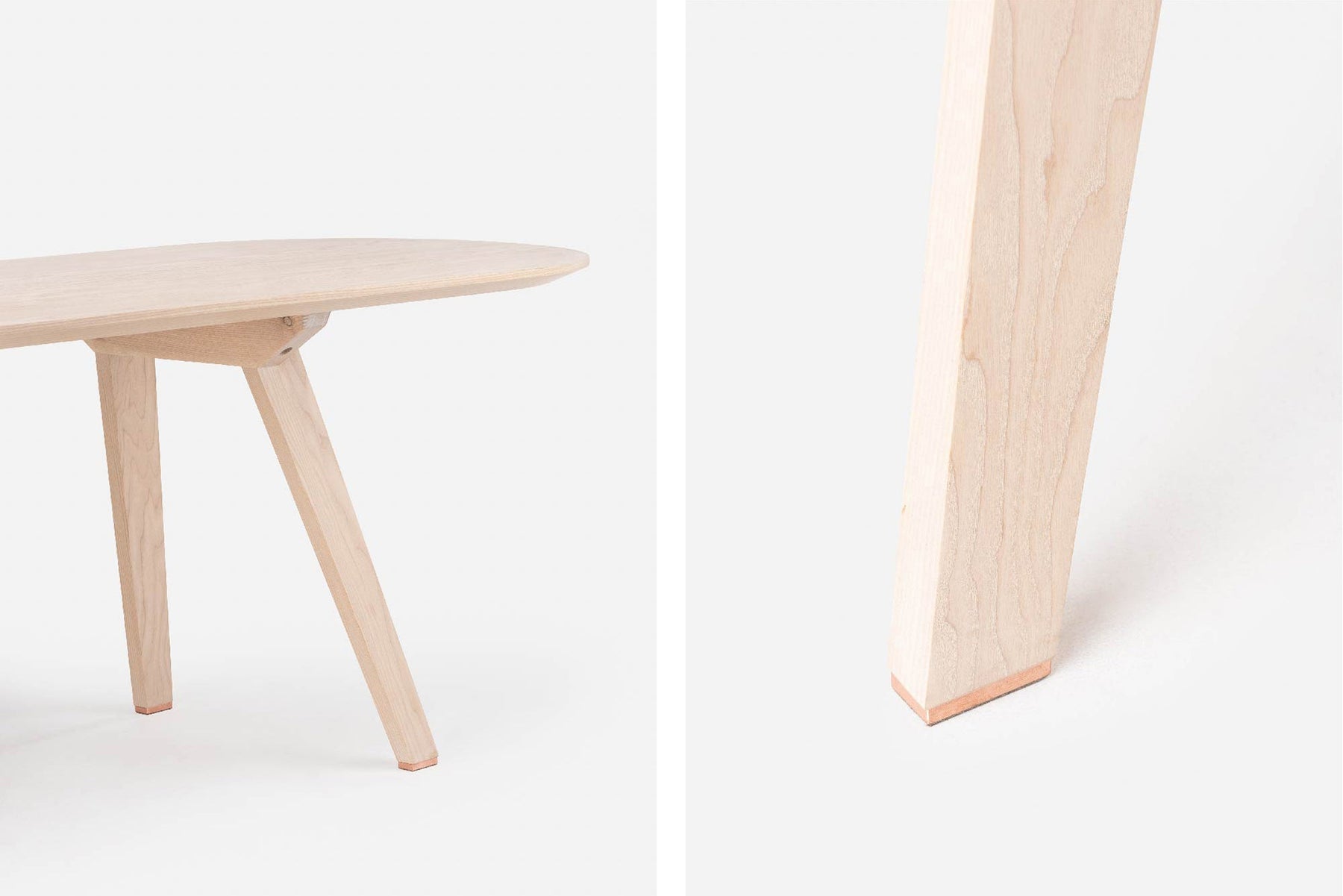 Timber is sustainable solid wood from North America or Europe, offering long-term repairability of the surface. Natural colour and grain variations in every plank make each piece an individual. Traditional wood joinery bonded with wood glue ensures structural integrity. All finishes are non-toxic and applied by hand, sprayed or rubbed.
