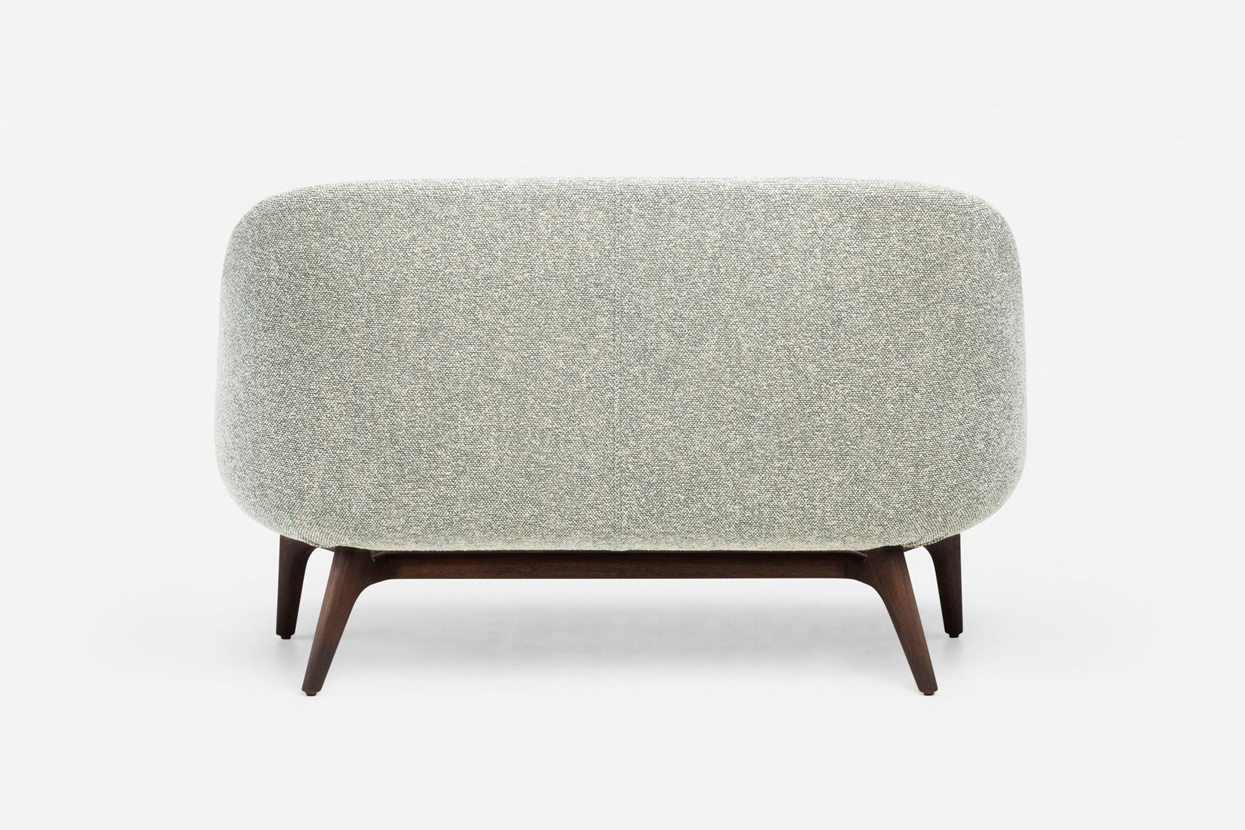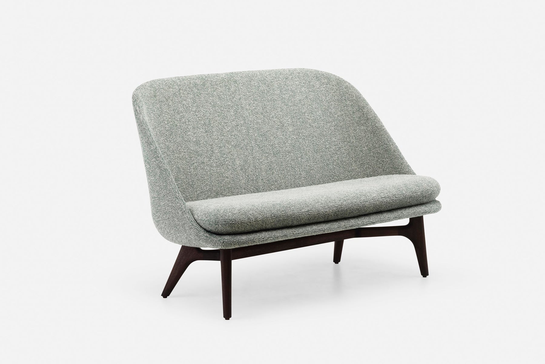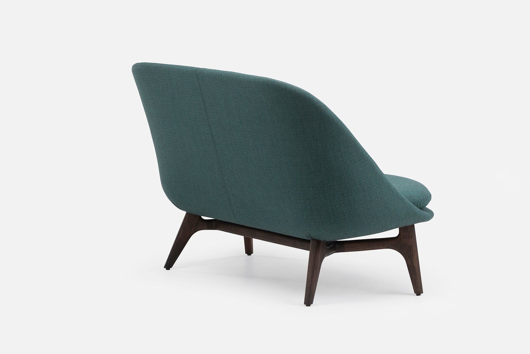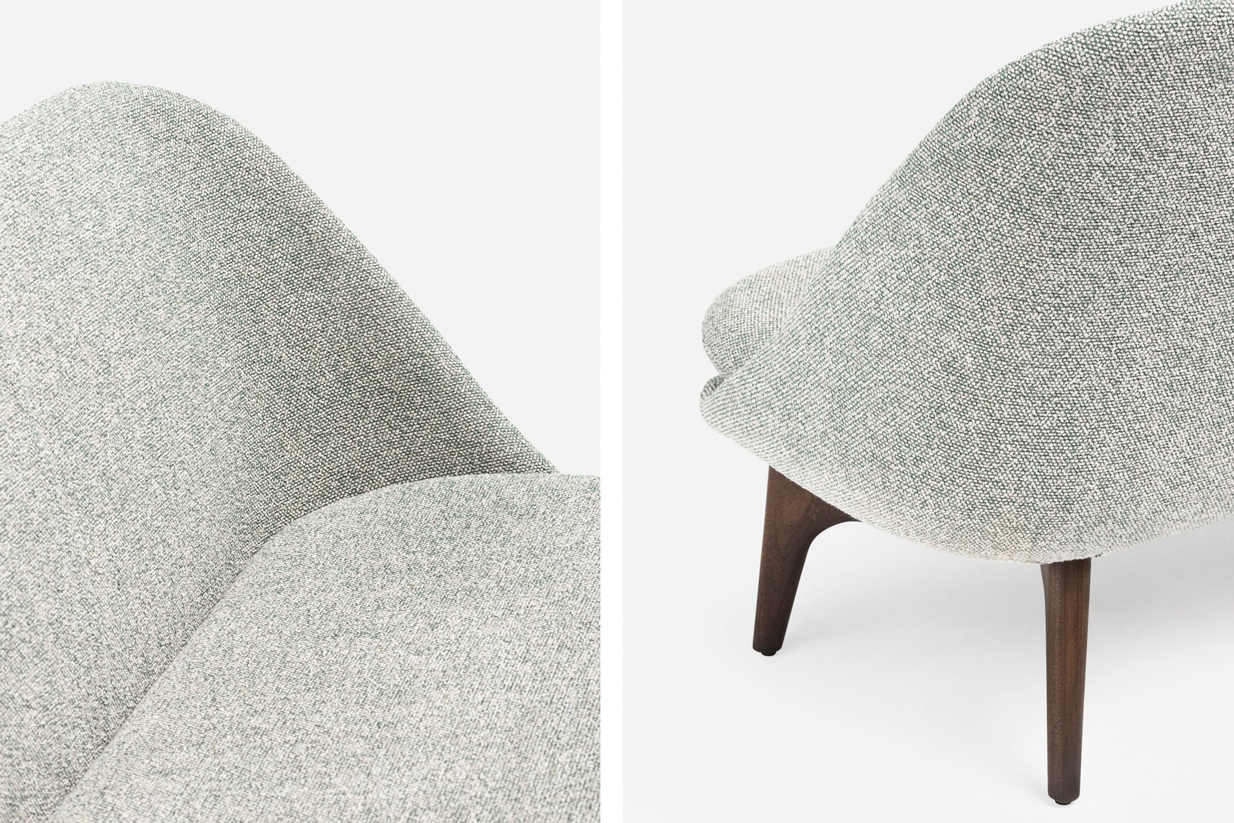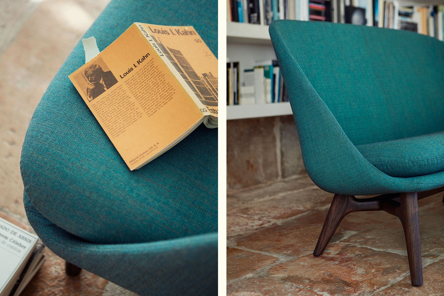 Solo Sofa is part of a series of Solo seating inspired by the Eames Shell Chair. An upholstered shell that hugs the sitting body to create a microcosmic universe for the person, becoming an object of shelter and refuge, where the person can be “solo” and undisturbed while being hugged in this position.