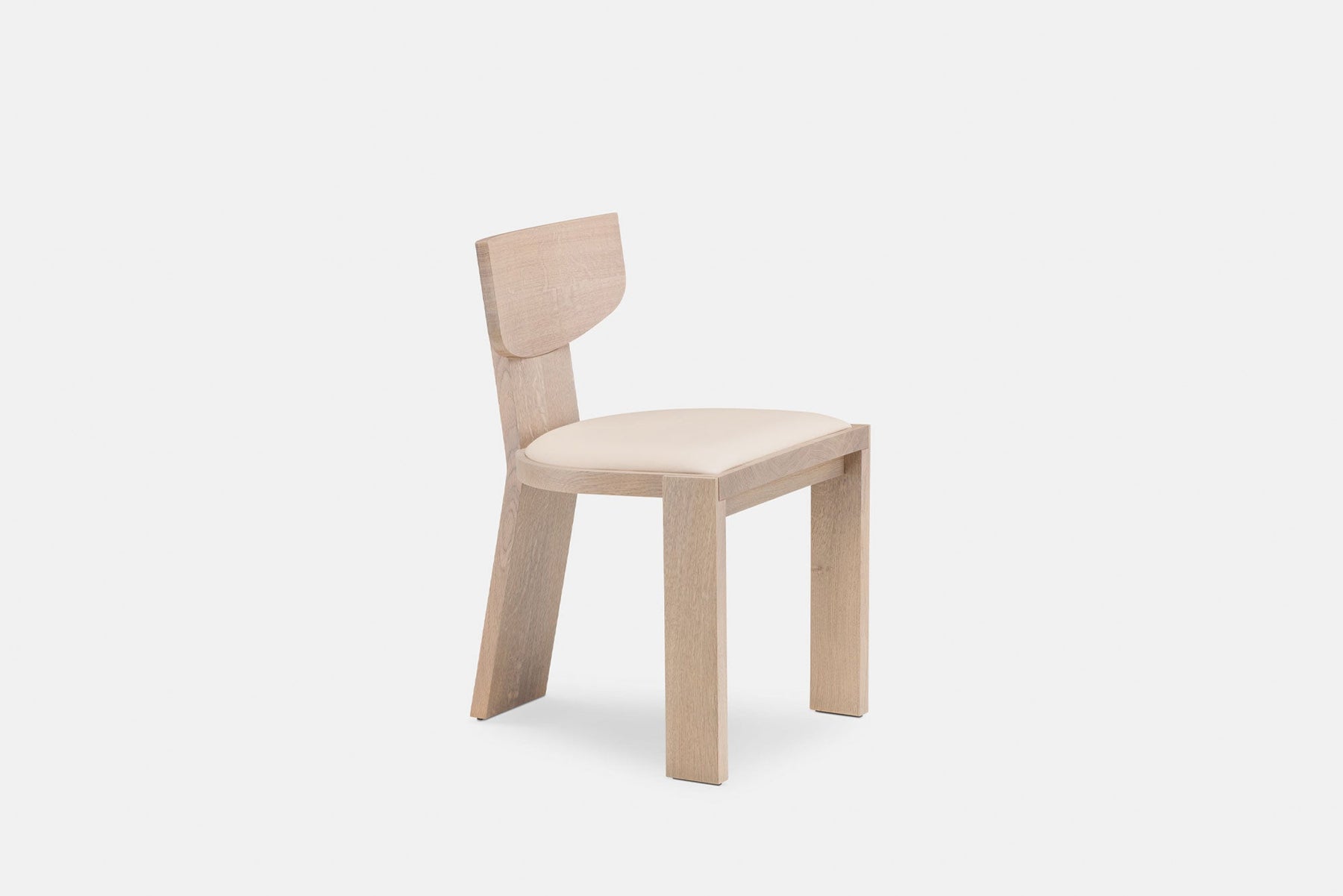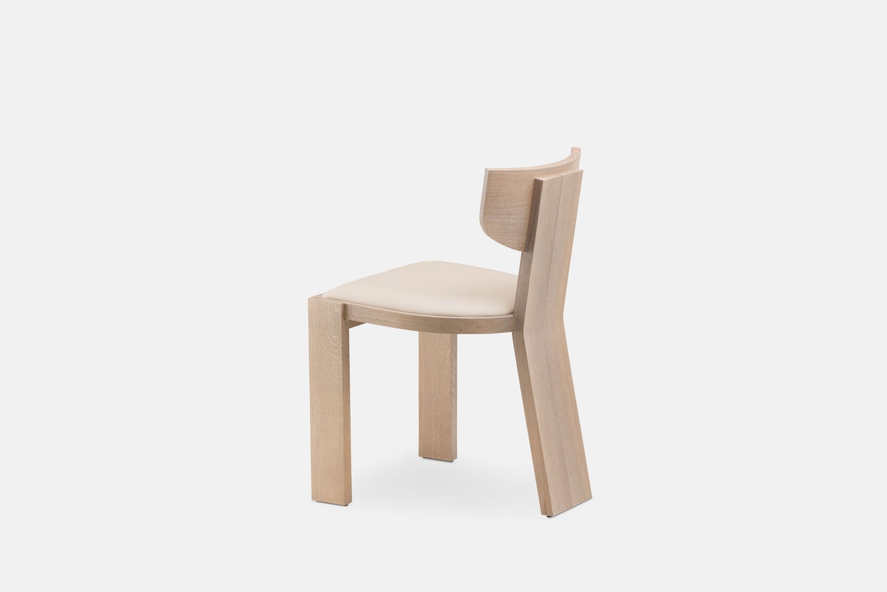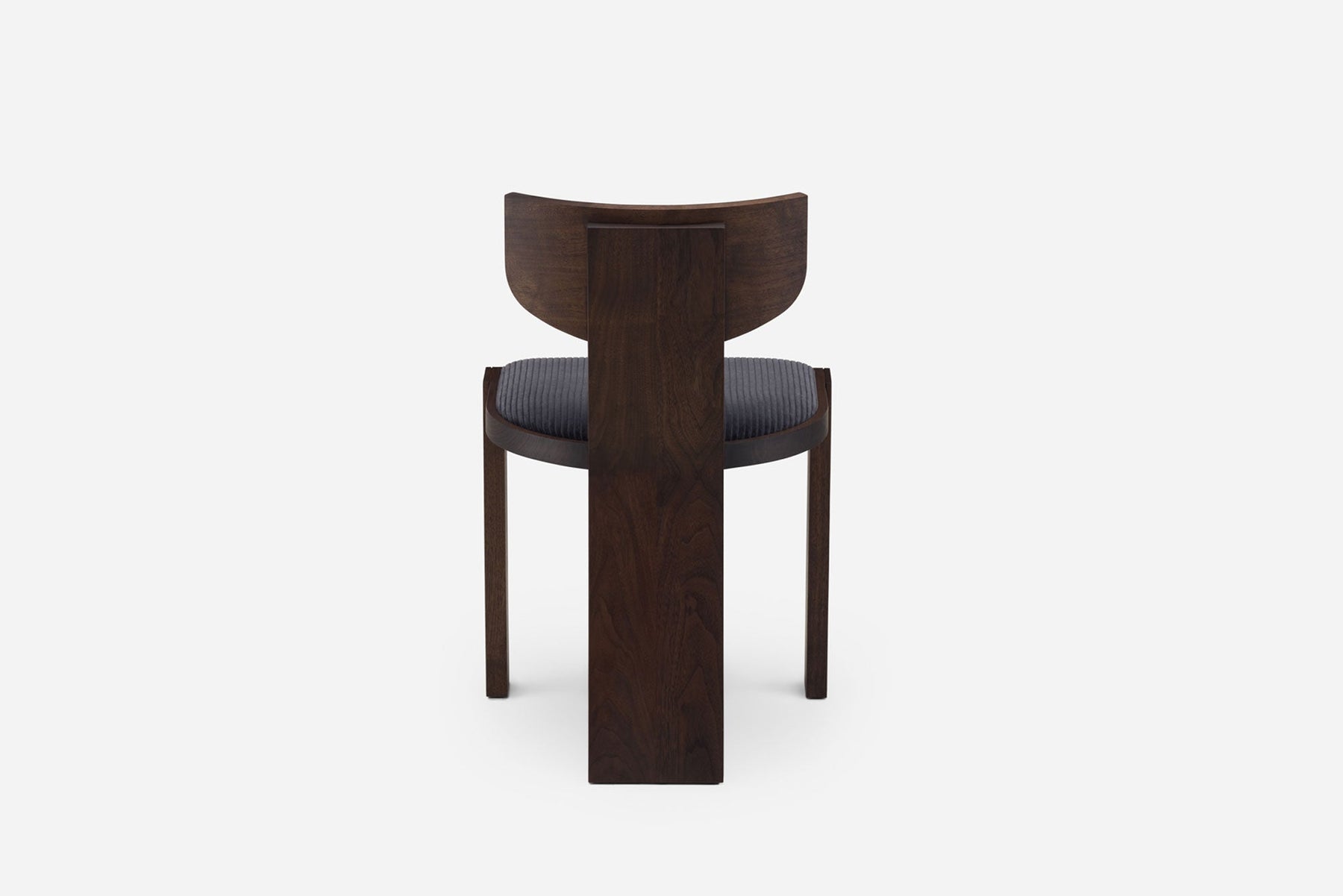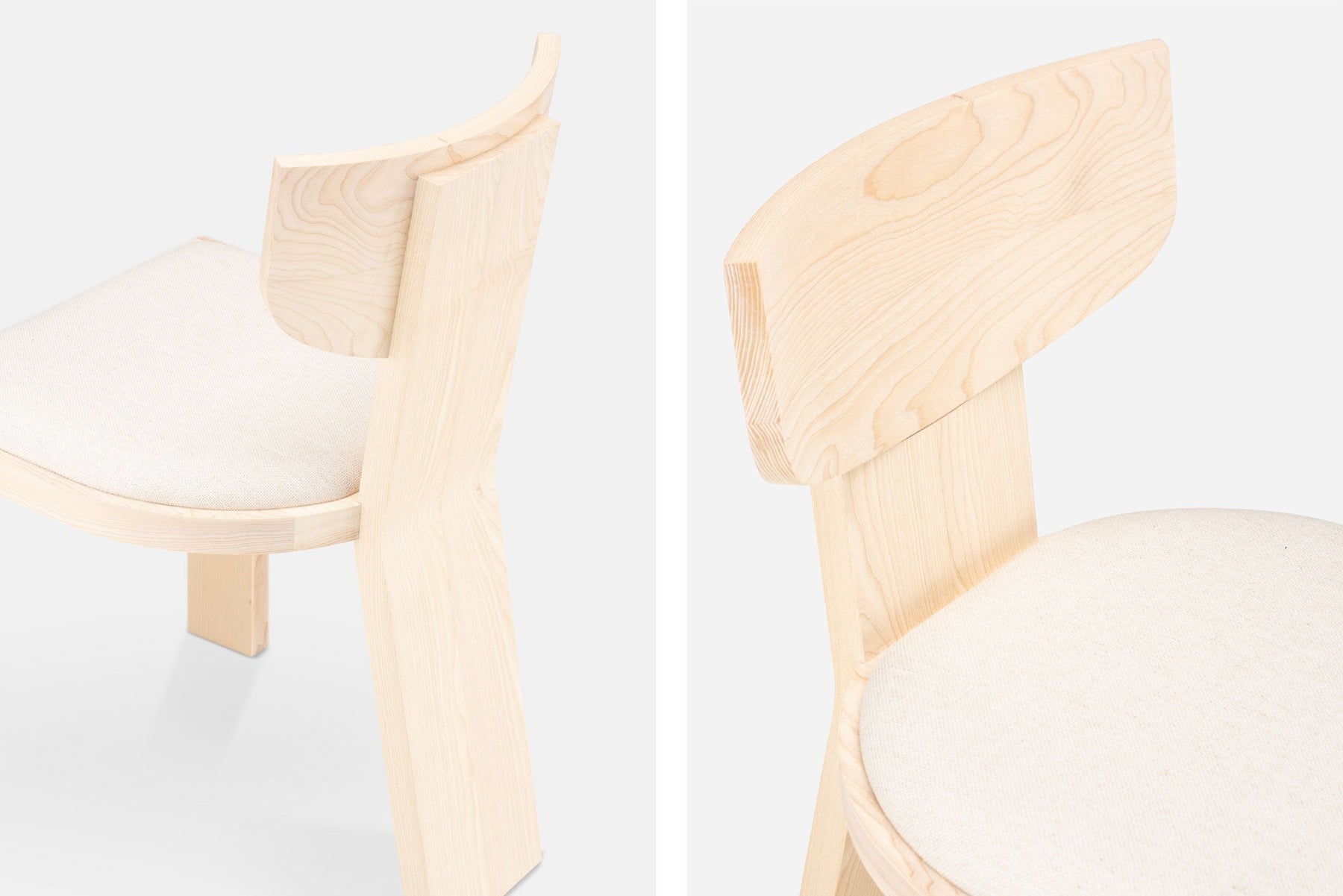 Vega chairs are named after the North Star of the Past and the Futures. Sculptural and totemic in shape, the three-legged chairs designed by Anthony Guerrée are crafted in solid timber and feature an upholstered seat. The imposing appearance contrasts with the delicate curve of the crescent moon backrest. In a playful game of opposites, Vega A and Vega B can be differentiated by the orientation of their backrests.