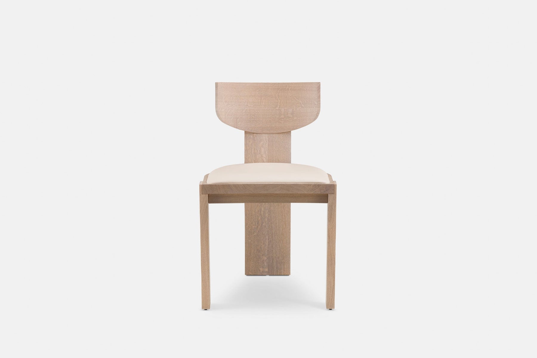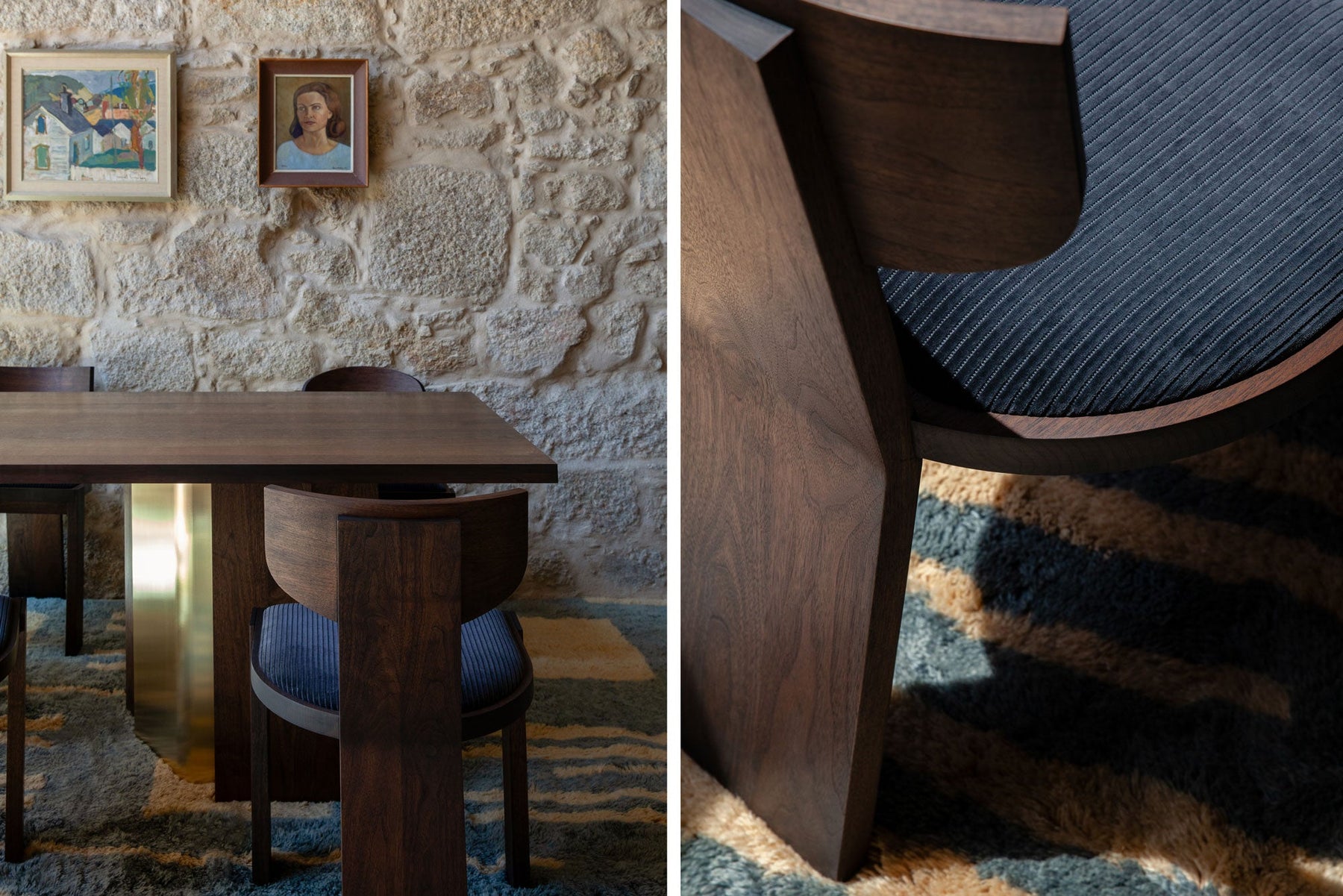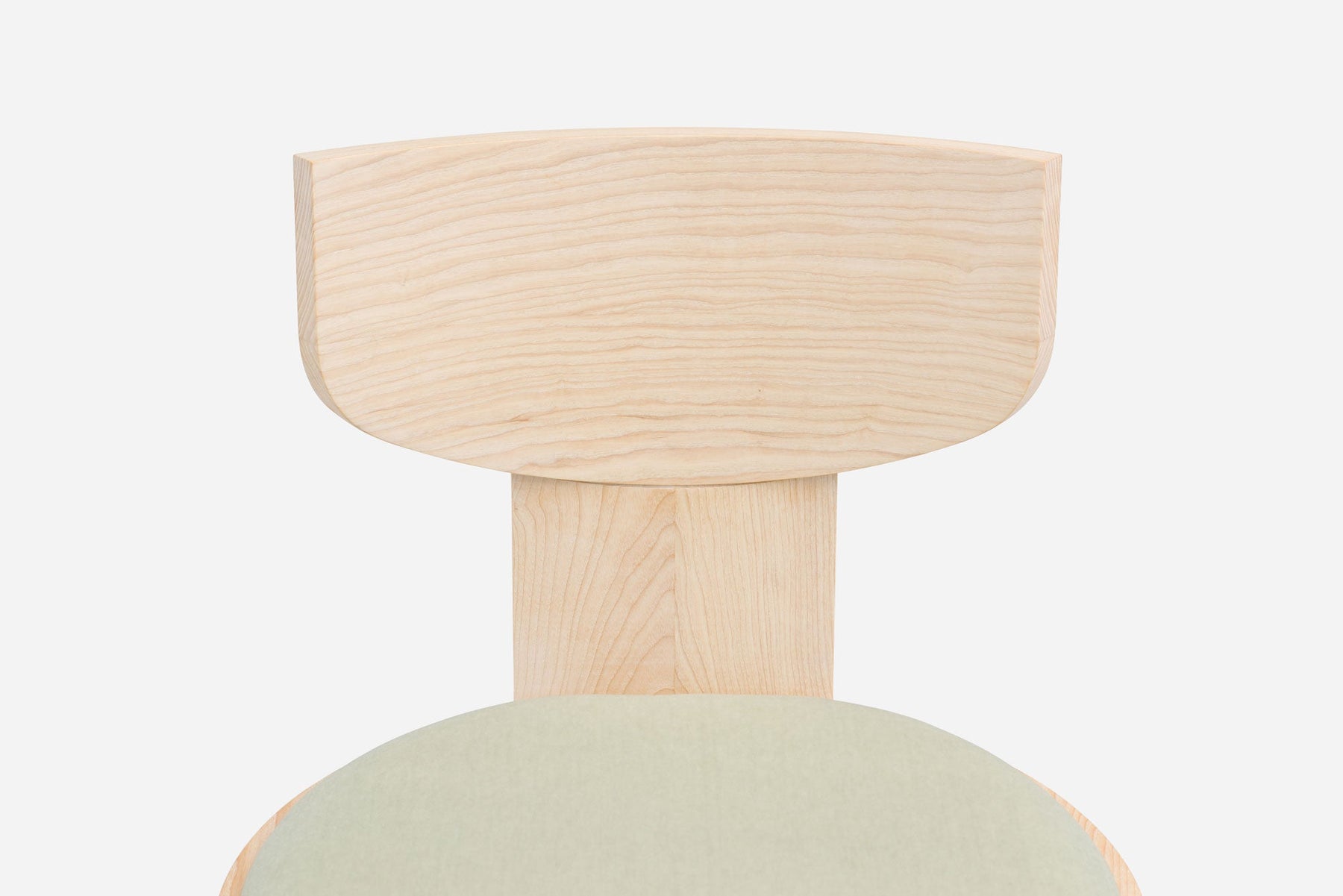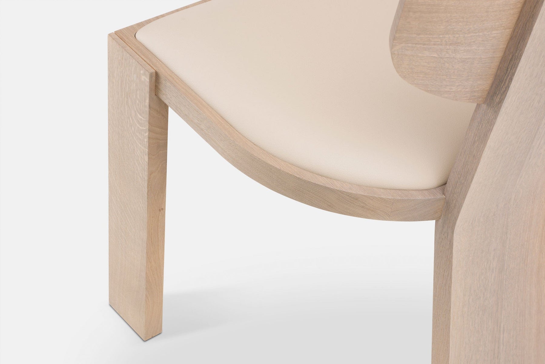 Vega chairs are named after the North Star of the Past and the Futures. Sculptural and totemic in shape, the three-legged chairs designed by Anthony Guerrée are crafted in solid timber and feature an upholstered seat. The imposing appearance contrasts with the delicate curve of the crescent moon backrest. In a playful game of opposites, Vega A and Vega B can be differentiated by the orientation of their backrests.