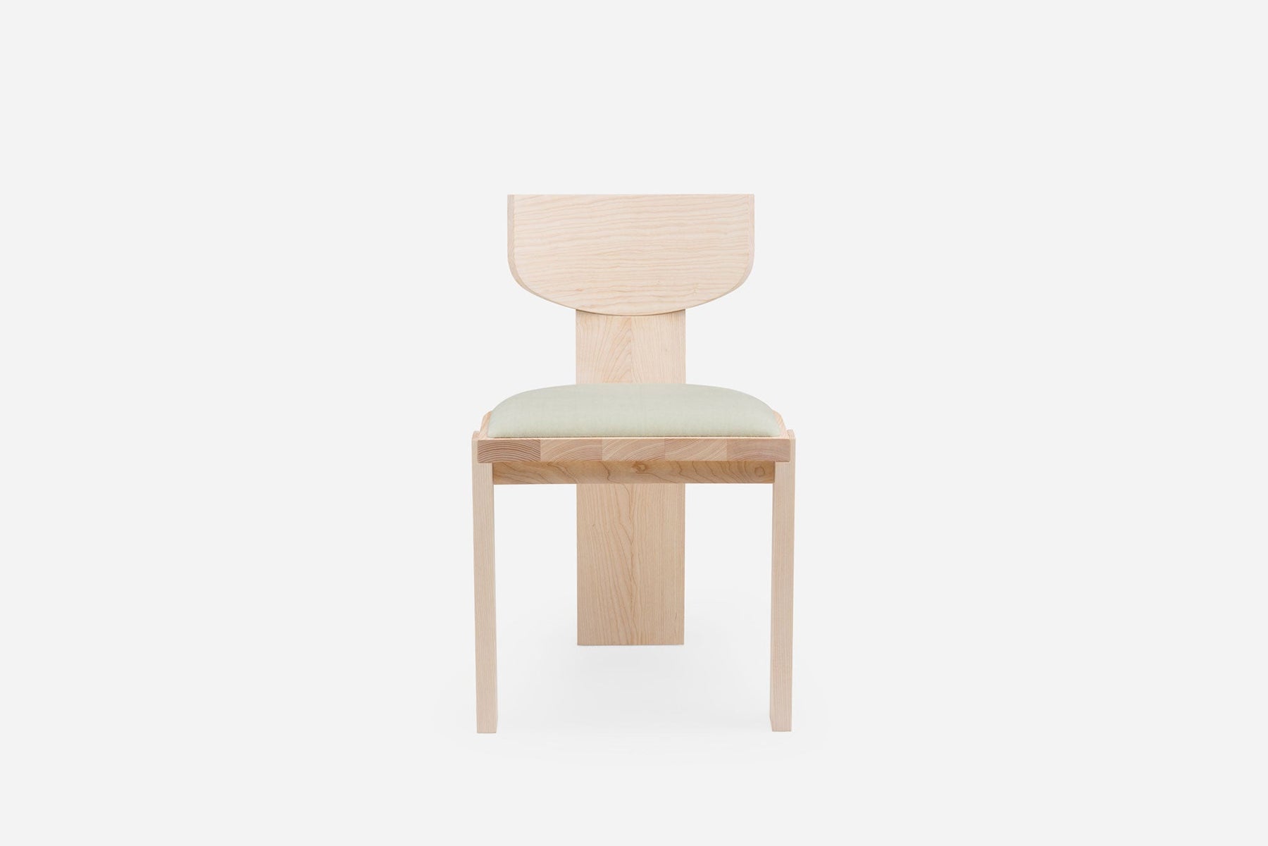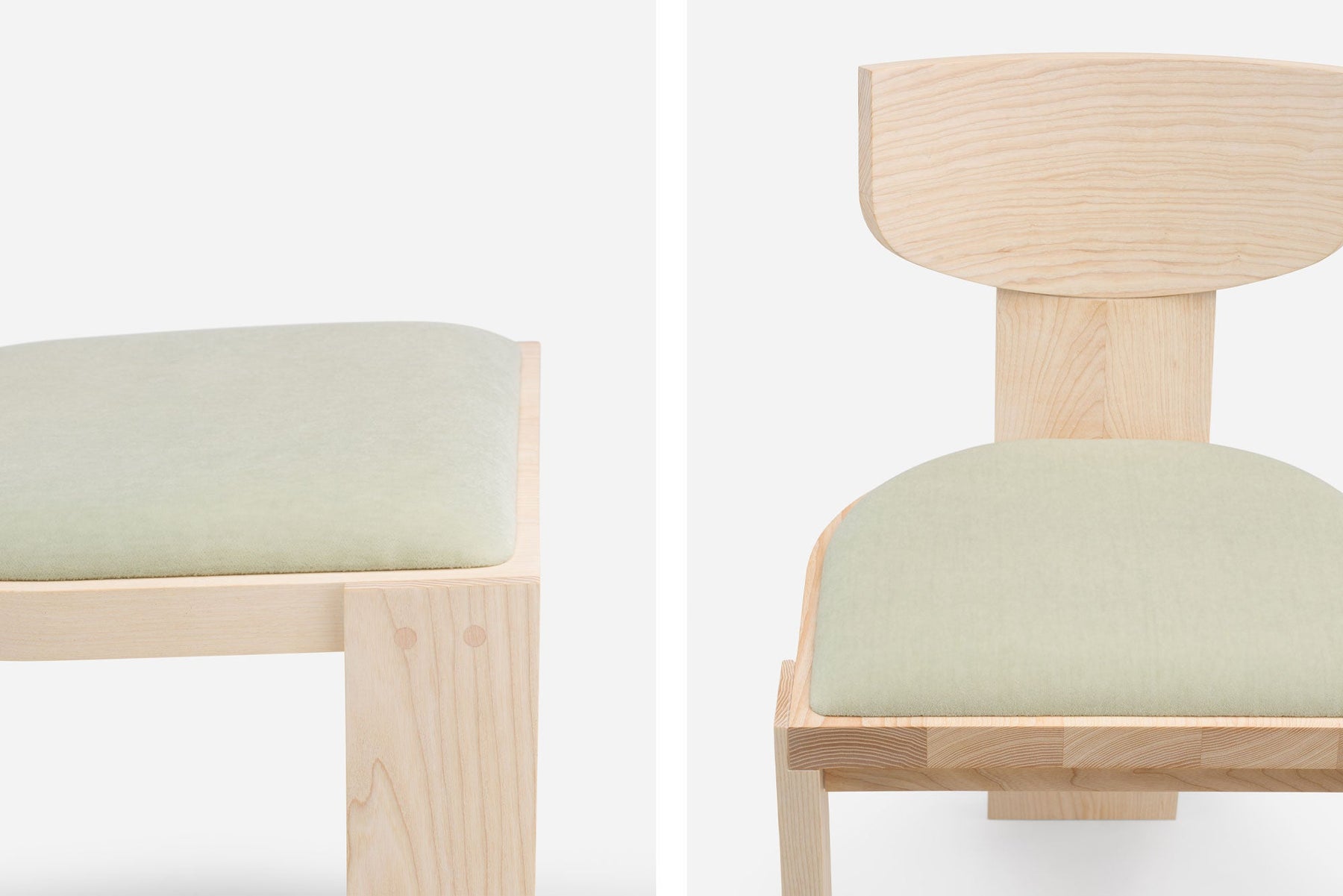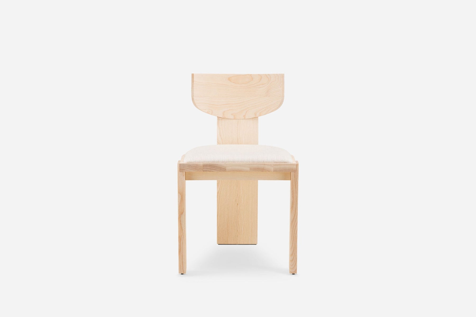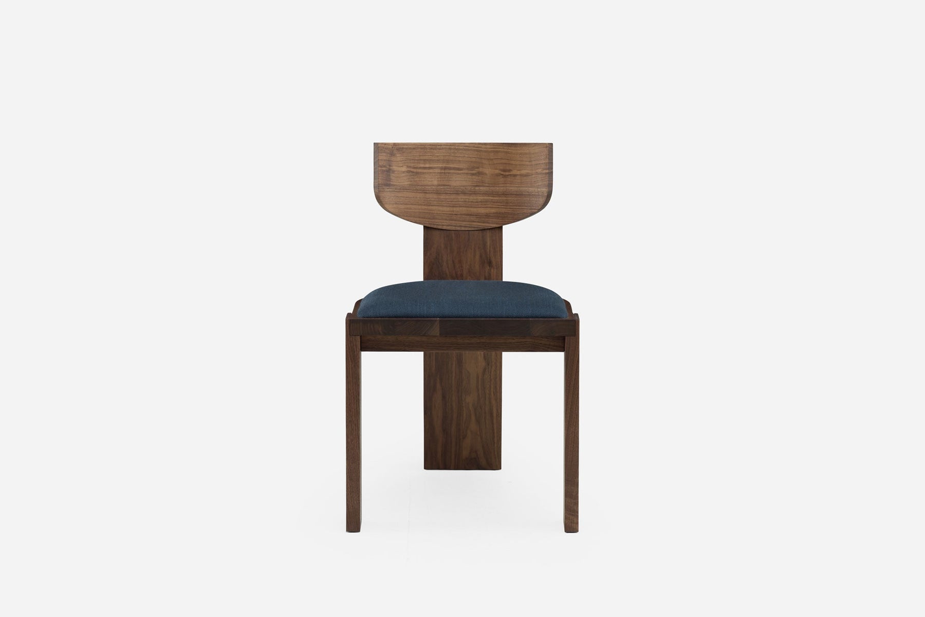 Vega chairs are named after the North Star of the Past and the Futures. Sculptural and totemic in shape, the three-legged chairs designed by Anthony Guerrée are crafted in solid timber and feature an upholstered seat. The imposing appearance contrasts with the delicate curve of the crescent moon backrest. In a playful game of opposites, Vega A and Vega B can be differentiated by the orientation of their backrests.